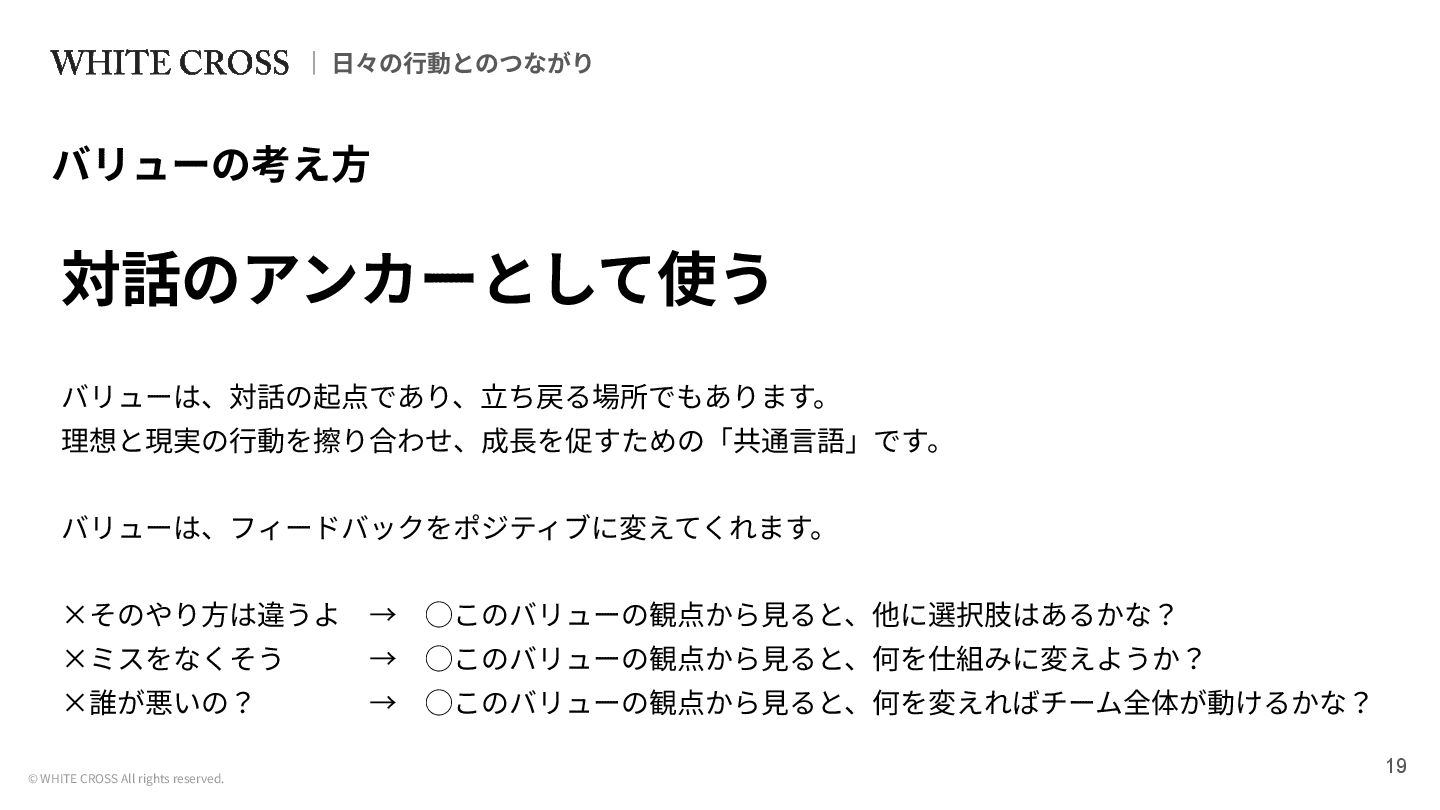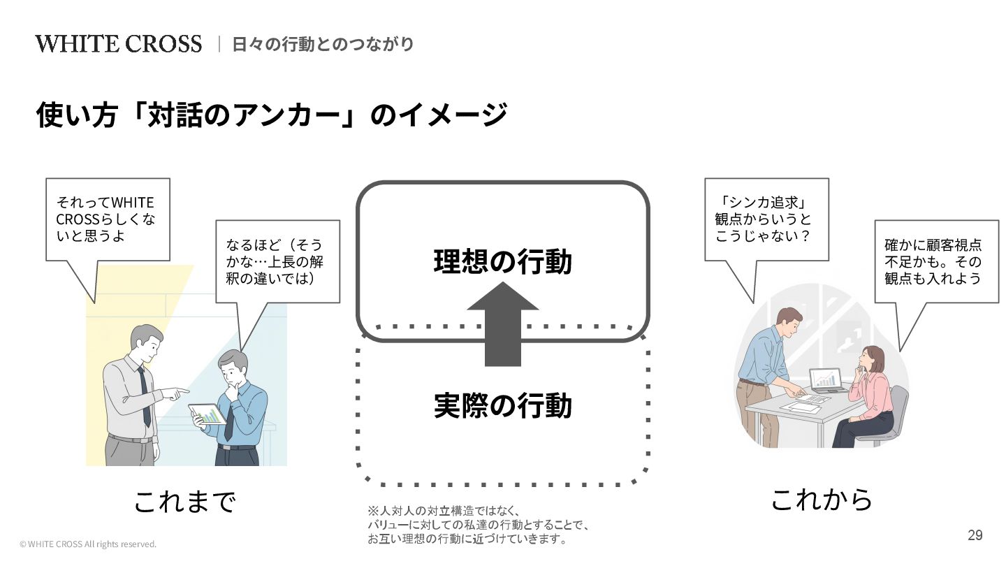 実際の⾏動 理想の⾏動 それってWHITE CROSSらしくな いと思うよ なるほど(そう かな…上⻑の解 釈の違いでは) 「シンカ追求」 観点からいうと こうじゃない? 確かに顧客視点 不⾜かも。その 観点も⼊れよう ※人対人の対立構造ではなく、 バリューに対しての私達の行動とすることで、 お互い理想の行動に近づけていきます。 これまで これから