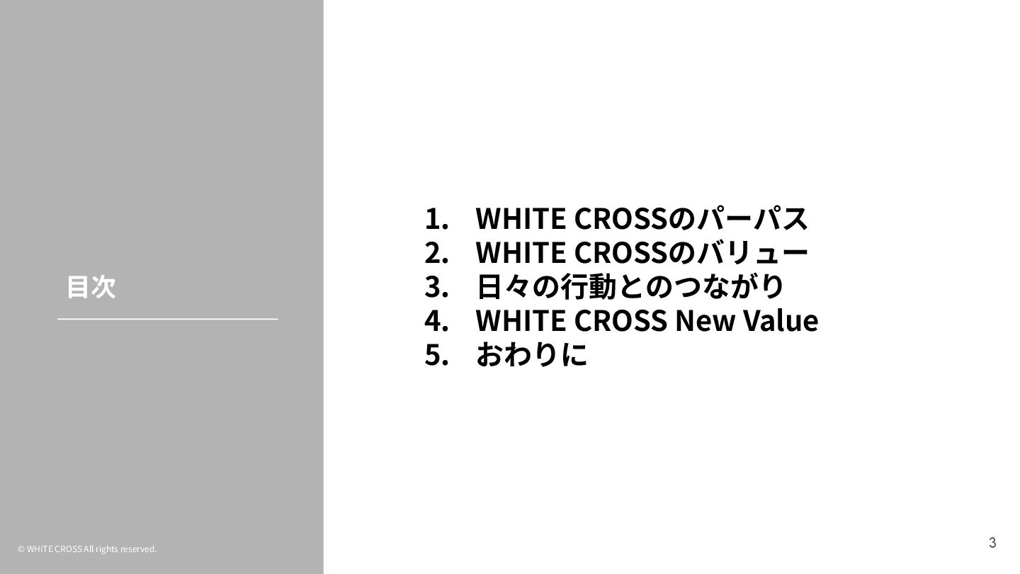 CROSSのパーパス 2. WHITE CROSSのバリュー 3. ⽇々の⾏動とのつながり 4. WHITE CROSS New Value 5. おわりに 3