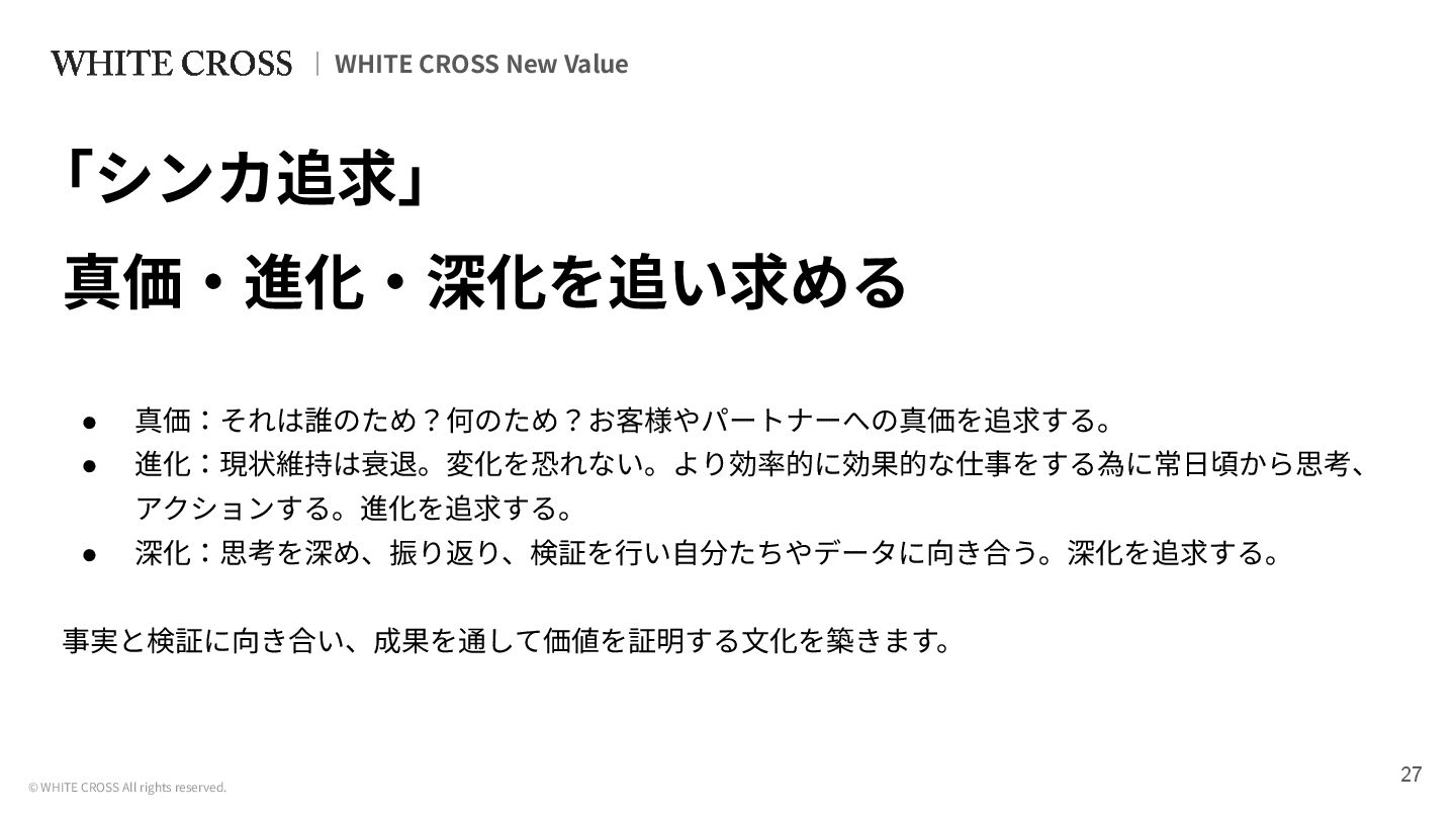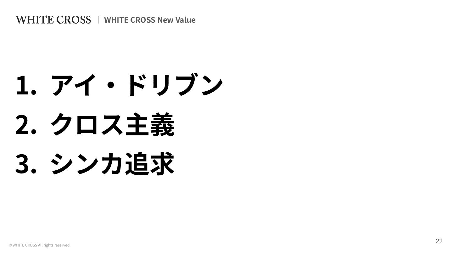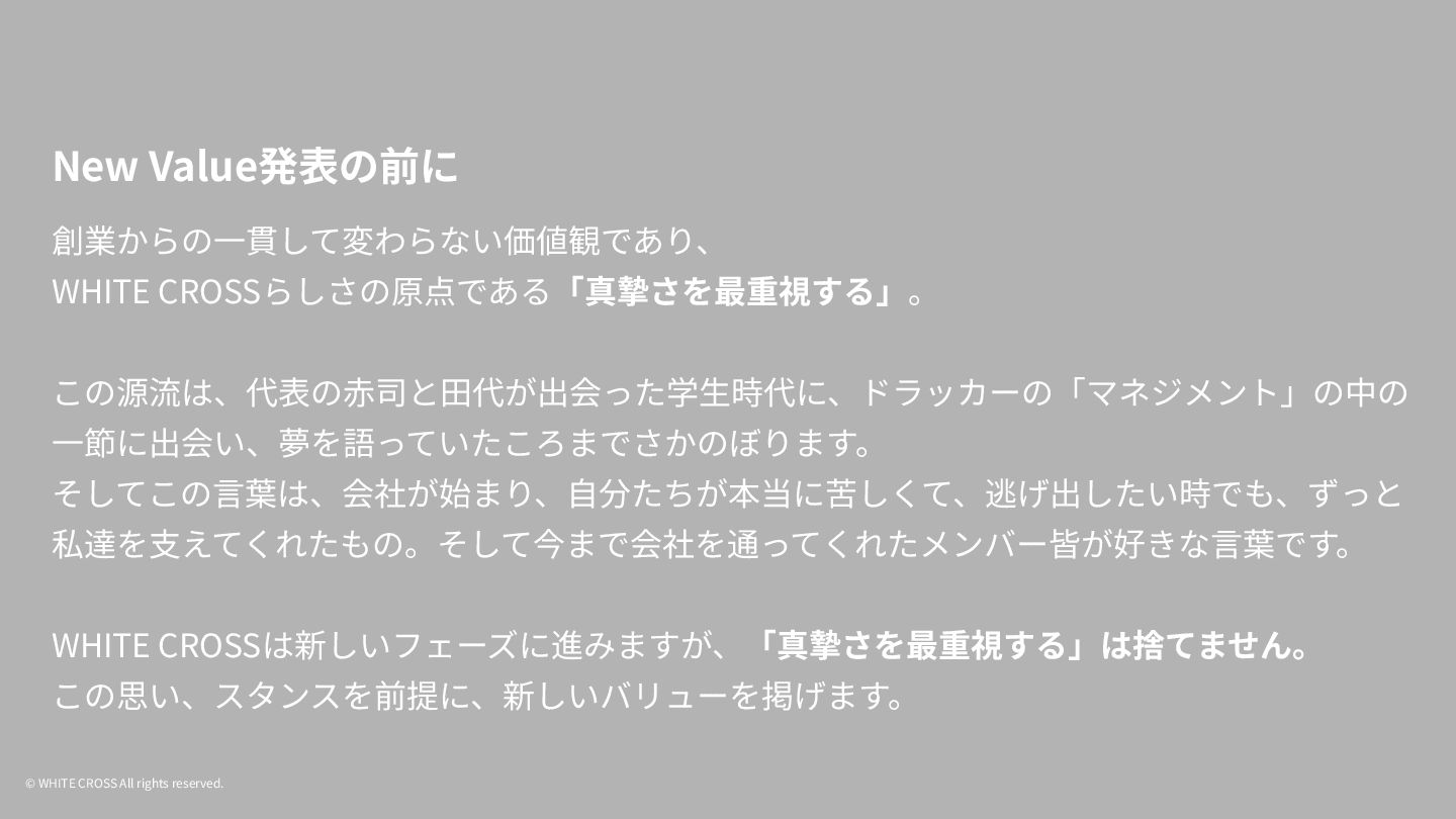 ⼀節に出会い、夢を語っていたころまでさかのぼります。 そしてこの⾔葉は、会社が始まり、⾃分たちが本当に苦しくて、逃げ出したい時でも、ずっと 私達を⽀えてくれたもの。そして今まで会社を通ってくれたメンバー皆が好きな⾔葉です。 WHITE CROSSは新しいフェーズに進みますが、「真摯さを最重視する」は捨てません。 この思い、スタンスを前提に、新しいバリューを掲げます。 New Value発表の前に