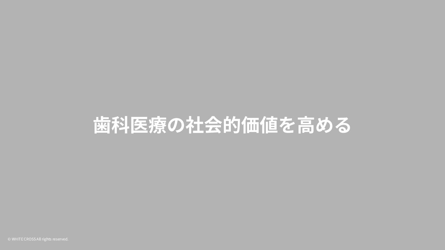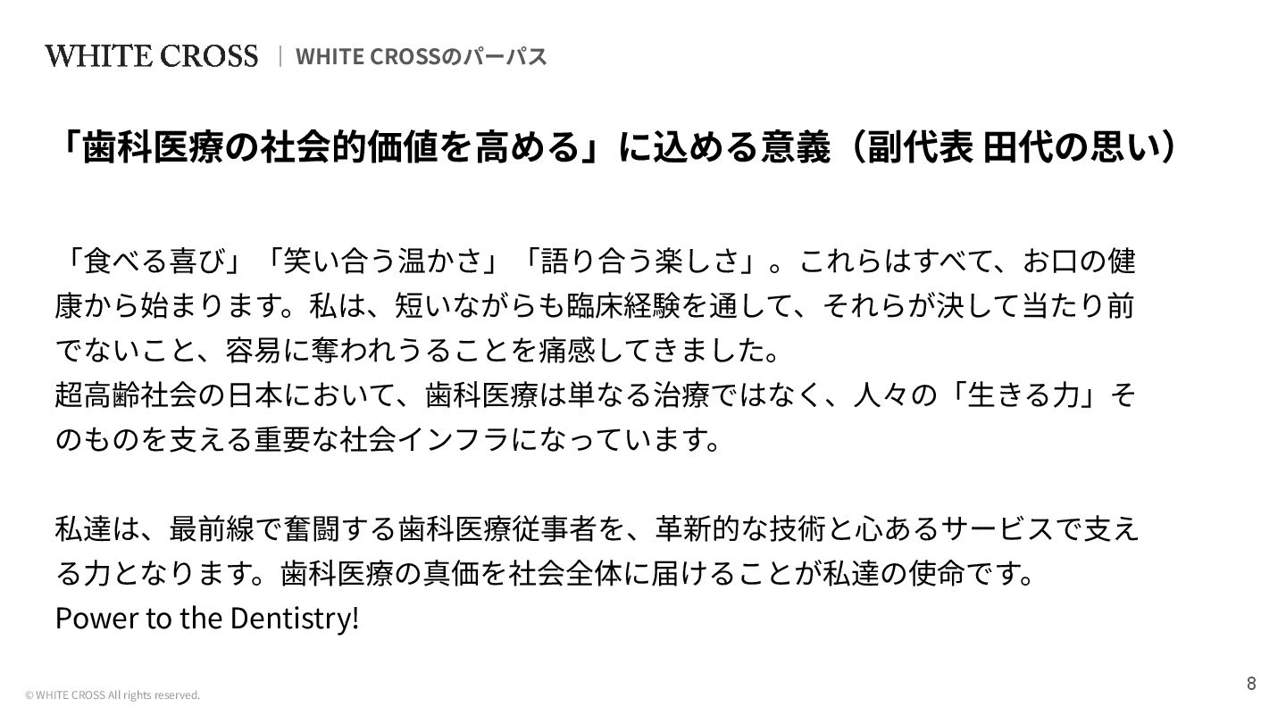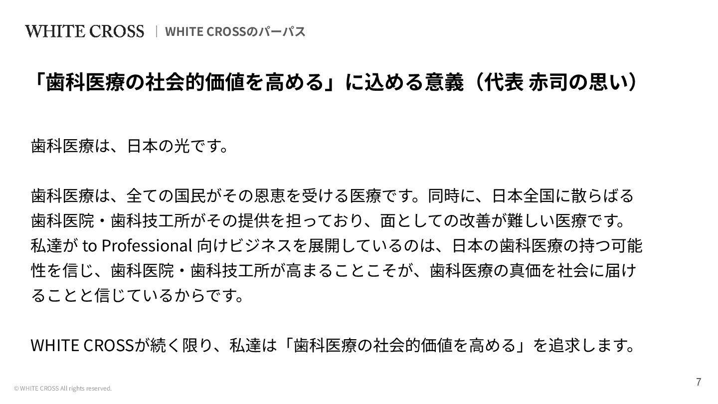 ⾚司の思い) ⻭科医療は、⽇本の光です。 ⻭科医療は、全ての国⺠がその恩恵を受ける医療です。同時に、⽇本全国に散らばる ⻭科医院‧⻭科技⼯所がその提供を担っており、⾯としての改善が難しい医療です。 私達が to Professional 向けビジネスを展開しているのは、⽇本の⻭科医療の持つ可能 性を信じ、⻭科医院‧⻭科技⼯所が⾼まることこそが、⻭科医療の真価を社会に届け ることと信じているからです。 WHITE CROSSが続く限り、私達は「⻭科医療の社会的価値を⾼める」を追求します。 7