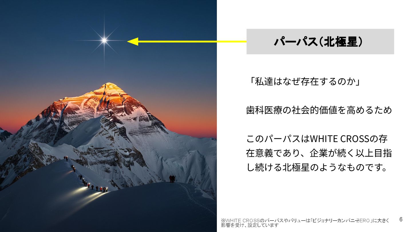CROSSのパーパス ⻭科医療の社会的価値を⾼める 多死社会の⽇本において、⼈々の⽣きる⼒を⽀える⻭科医療は、健康 や幸福の追求、そして国⼒維持の観点でも重要性を増します。 ⻭科医療の真価を社会全体へ循環させる黒⼦となり、⽇本社会を元気 にしていくことが、私達のパーパスです。 5