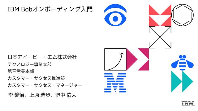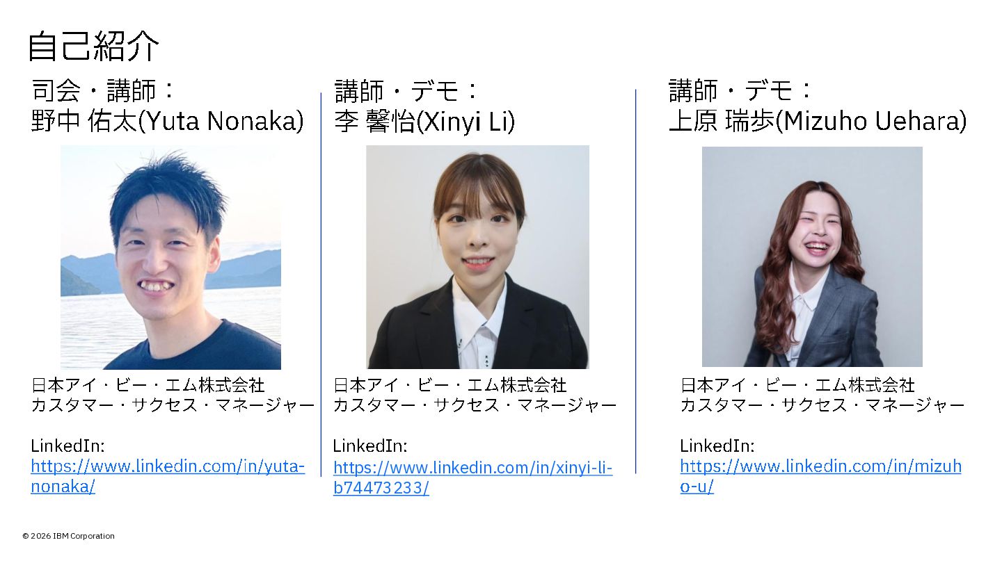 nonaka/ 司会・講師: 野中 佑太(Yuta Nonaka) 日本アイ・ビー・エム株式会社 カスタマー・サクセス・マネージャー LinkedIn: https://www.linkedin.com/in/mizuh o-u/ 講師・デモ: 上原 瑞歩(Mizuho Uehara ) 講師・デモ: 李 馨怡(Xinyi Li ) 日本アイ・ビー・エム株式会社 カスタマー・サクセス・マネージャー LinkedIn: https://www.linkedin.com/in/xinyi-li- b74473233/