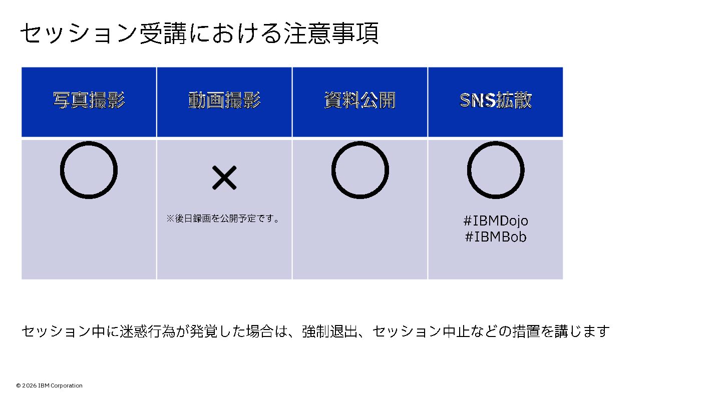 × ※後日録画を公開予定です。 ◯ ◯ #IBMDojo #IBMBob セッション受講における注意事項 セッション中に迷惑行為が発覚した場合は、強制退出、セッション中止などの措置を講じます