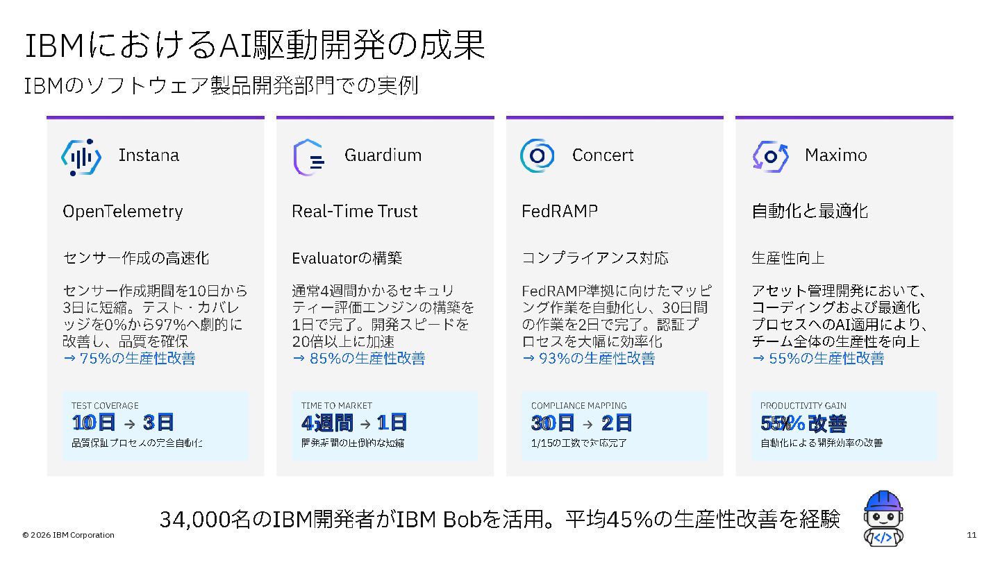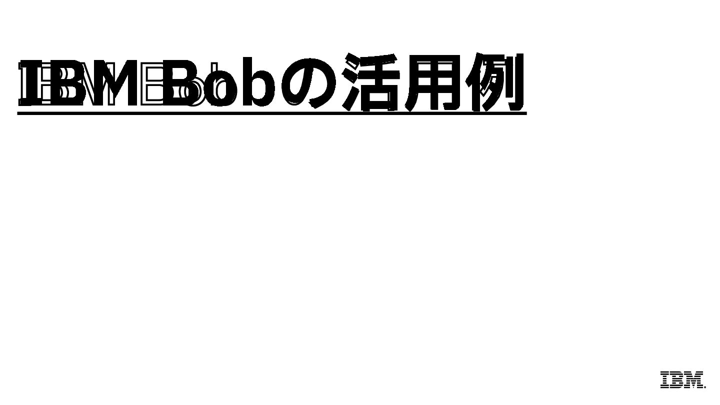 Trust Evaluator の構築 通常4週間かかるセキュリ ティー 評価エンジンの構築を 1日で完了。開発スピードを 20 倍以上に加速 → 85% の生産性改善 TIME TO MARKET 4週間 1日 開発期間の圧倒的な短縮 Concert FedRAMP コンプライアンス対応 FedRAMP 準拠に向けたマッピ ング作業を自動化し、 30 日間 の作業を2日で完了。認証プ ロセスを大幅に効率化 → 93% の生産性改善 COMPLIANCE MAPPING 30 日 2日 1/15 の工数で対応完了 Maximo 自動化と最適化 生産性向上 アセット管理開発において、 コーディングおよび最適化 プロセスへの AI 適用により、 チーム全体の生産性を向上 → 55% の生産性改善 PRODUCTIVITY GAIN 55% 改善 自動化による開発効率の改善 Instana OpenTelemetry センサー作成の高速化 センサー作成期間を 10 日から 3日に短縮。テスト ・ カバレ ッジを 0% から 97% へ劇的に 改善し、品質を確保 → 75% の生産性改善 TEST COVERAGE 品質保証プロセスの完全自動化 10 日 3日 34,000 名のIBM 開発者がIBM Bob を活用。平均 45% の生産性改善を経験 IBM のソフトウェア製品開発部門での実例