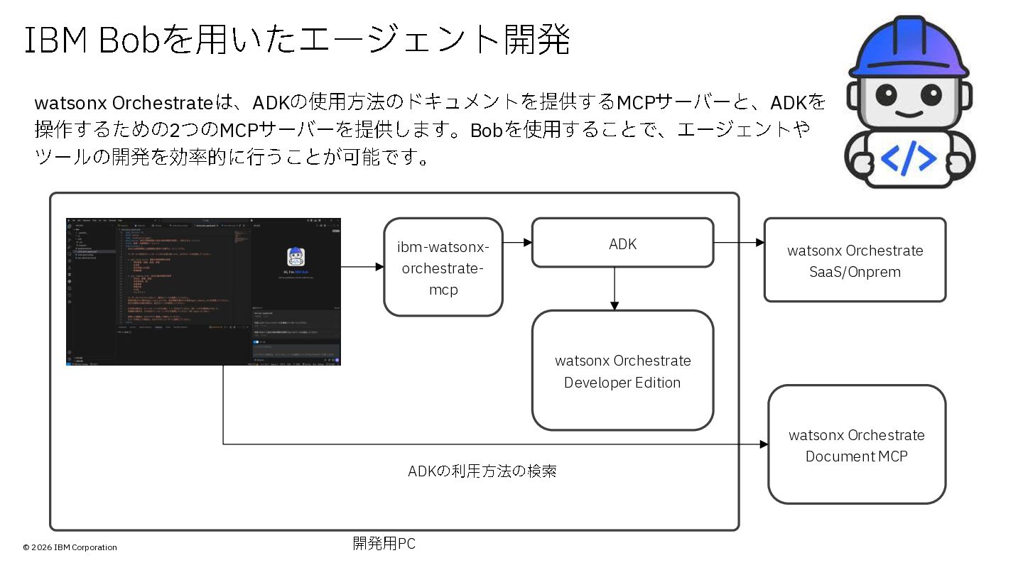 © 2026 IBM Corporation IBM Bob を用いたエージェント開発 watsonx Orchestrateは、 ADKの使用方法のドキュメントを提供する