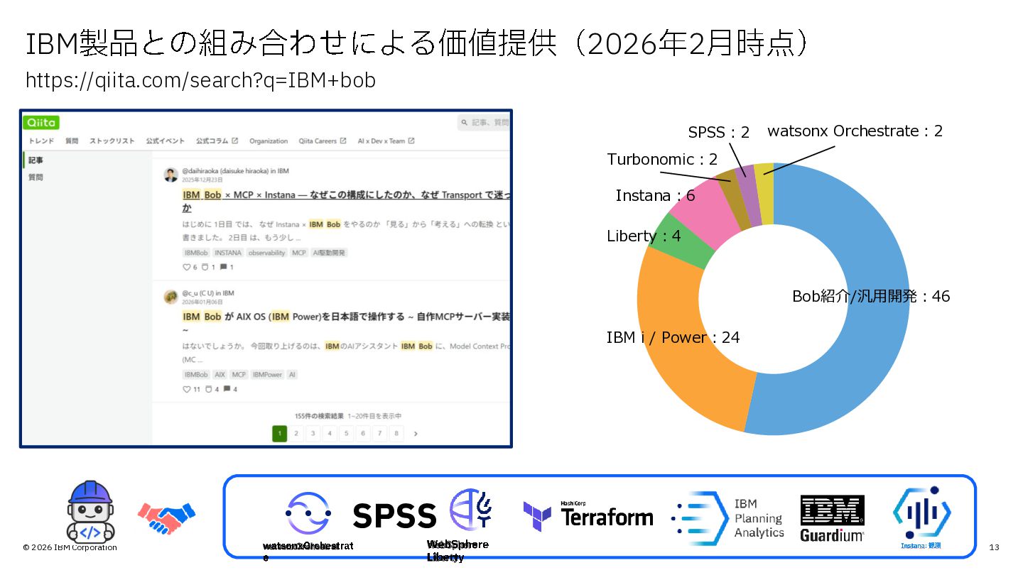 © 2026 IBM Corporation 13 IBM製品との組み合わせによる価値提供( 2026年2月時点) https://qiita.com/search?q=IBM+bob Bob紹介/汎用開発:46 IBM