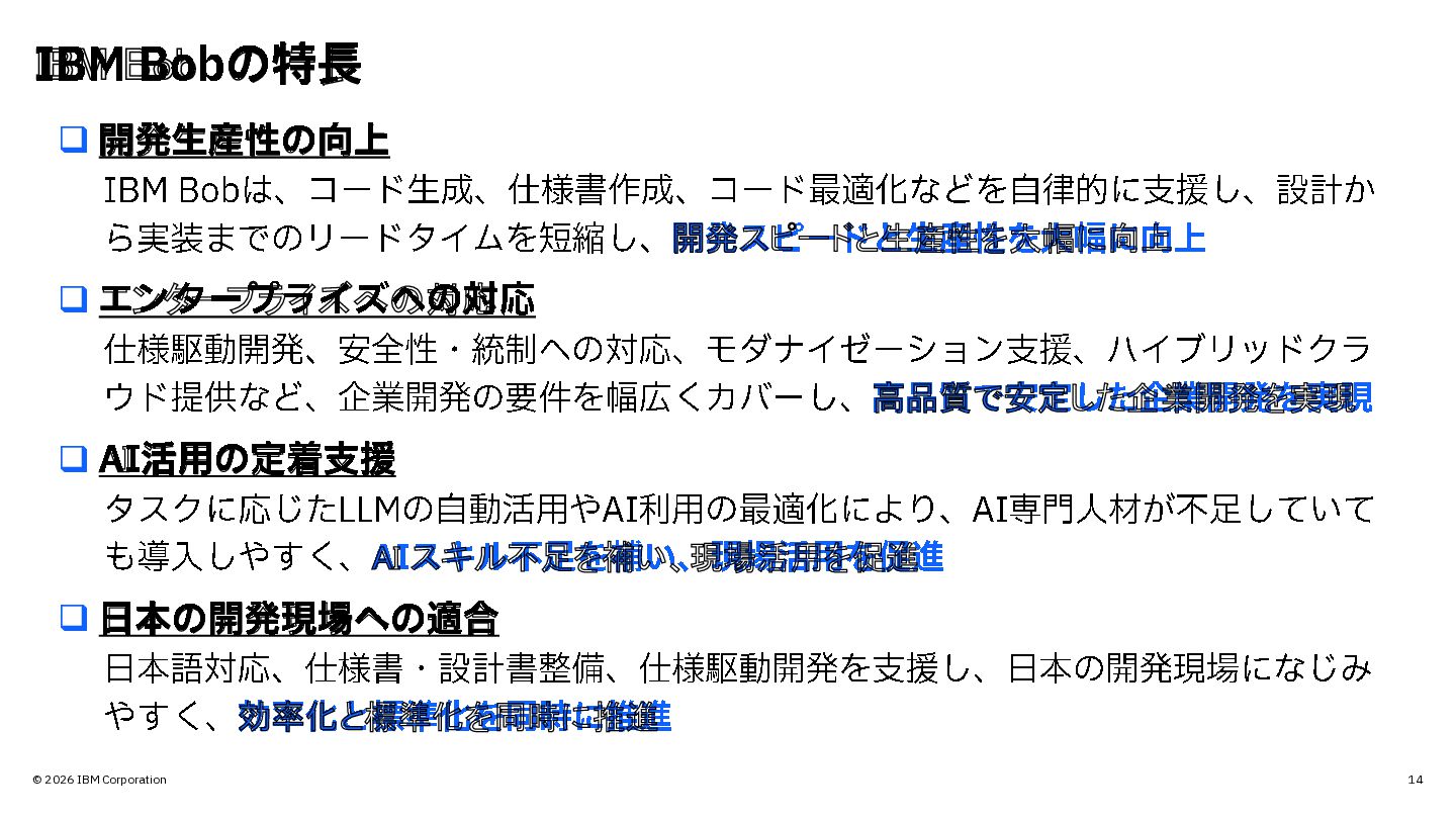 IBM Bob は、コード生成、仕様書作成、コード最適化などを自律的に支援し、設計か ら実装までのリードタイムを短縮し、 開発スピードと生産性を大幅に向上 ❑ エンタープライズへの対応 仕様駆動開発、安全性・統制への対応、モダナイゼーション支援、ハイブリッドクラ ウド提供など、企業開発の要件を幅広くカバーし、 高品質で安定した企業開発を実現 ❑ AI 活用の定着支援 タスクに応じた LLMの自動活用やAI 利用の最適化により、 AI 専門人材が不足していて も導入しやすく、 AI スキル不足を補い、現場活用を促進 ❑ 日本の開発現場への適合 日本語対応、仕様書・設計書整備、仕様駆動開発を支援し、日本の開発現場になじみ やすく、 効率化と標準化を同時に推進