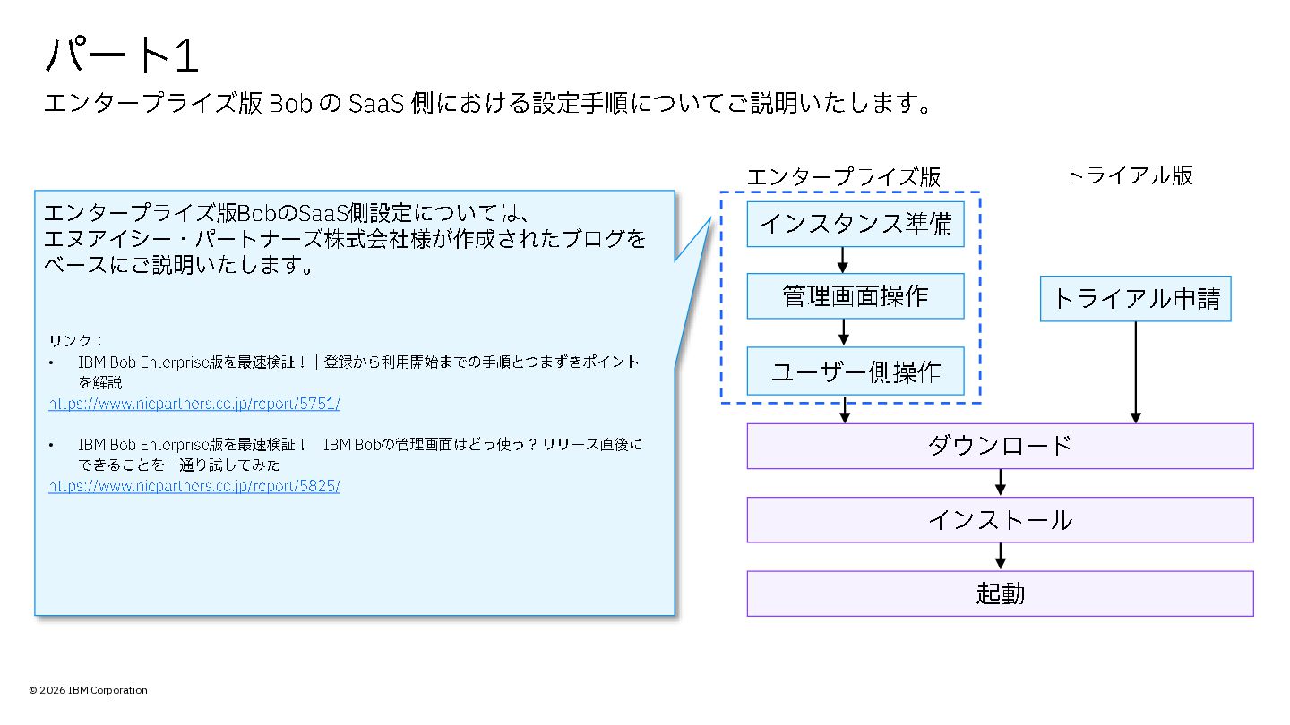 側における設定手順についてご説明いたします。 エンタープライズ版 トライアル版 トライアル申請 エンタープライズ版 Bob のSaaS側設定については、 エヌアイシー・パートナーズ株式会社様が作成されたブログを ベースにご説明いたします。 リンク: • IBM Bob Enterprise 版を最速検証!|登録から利用開始までの手順とつまずきポイント を解説 https://www.nicpartners.co.jp/report/5751/ • IBM Bob Enterprise 版を最速検証!|IBM Bob の管理画面はどう使う? リリース直後に できることを一通り試してみた https://www.nicpartners.co.jp/report/5825/ ダウンロード インストール 起動 管理画面操作 インスタンス準備 ユーザー側操作