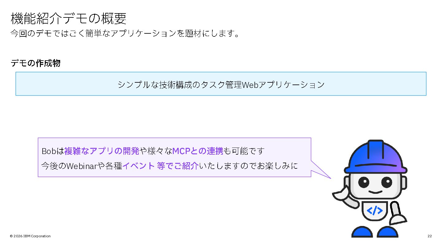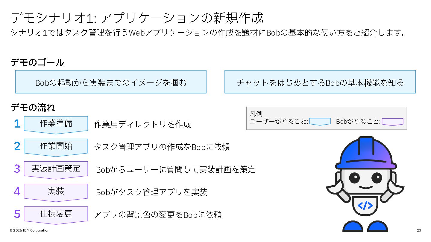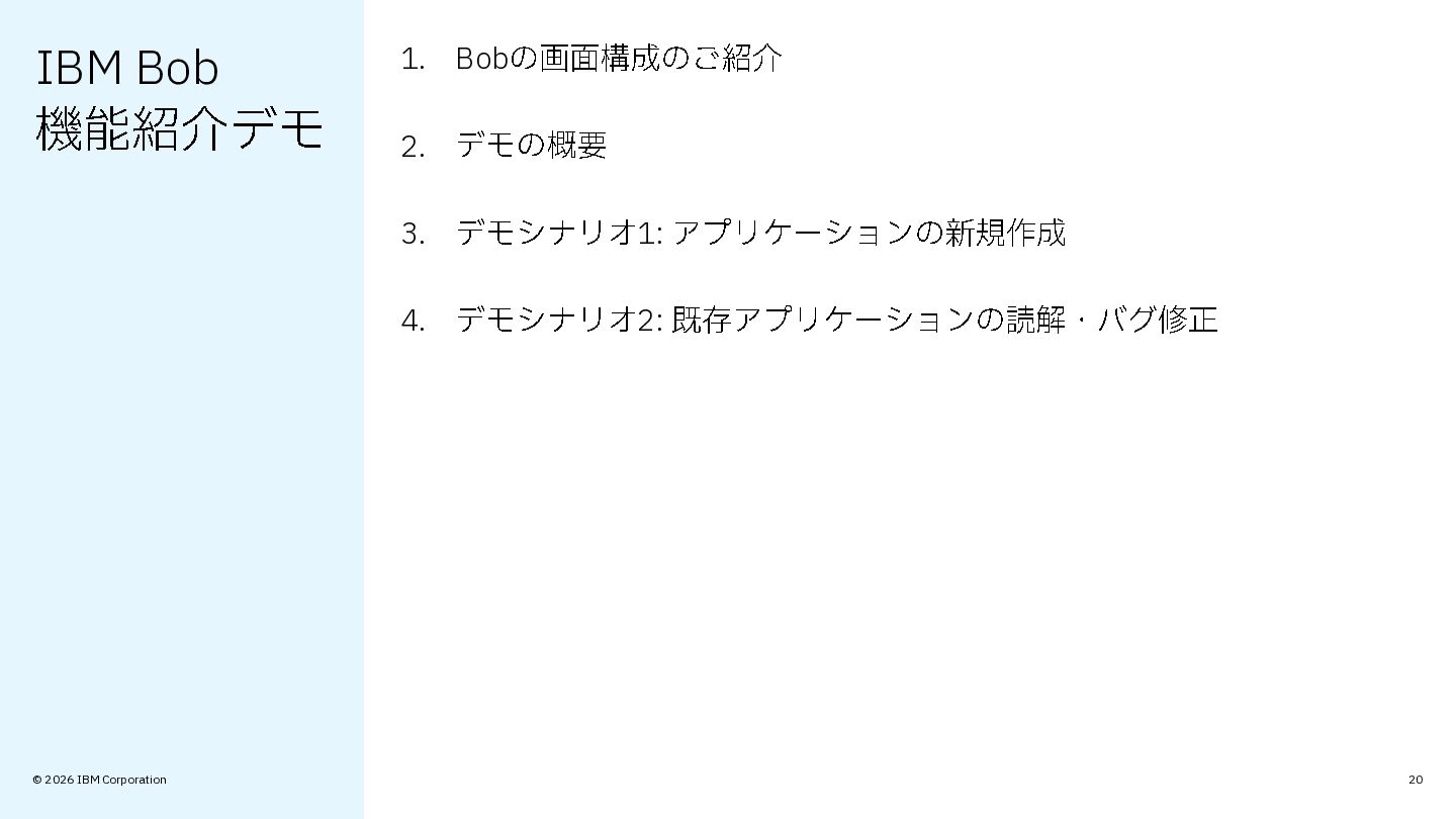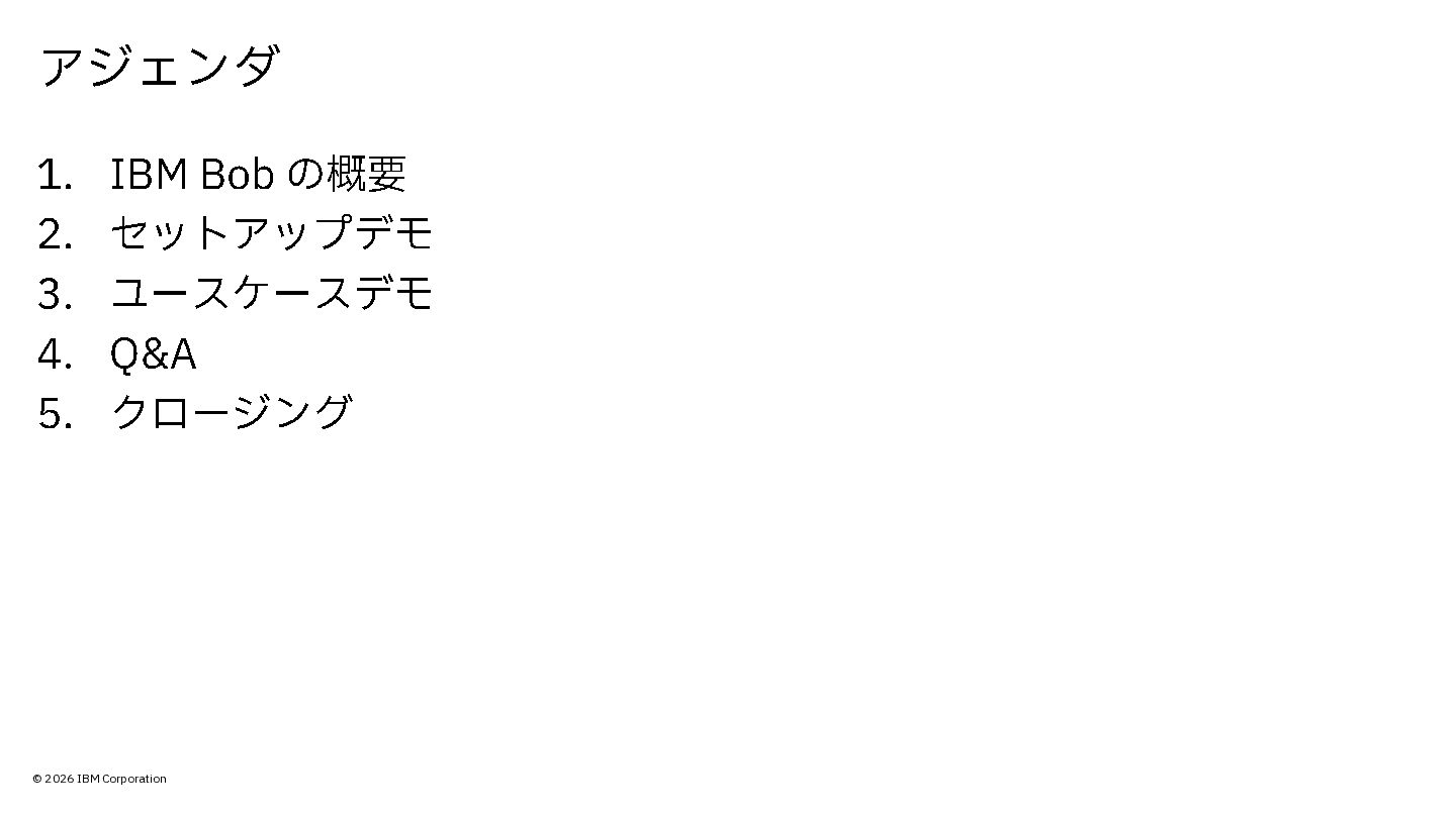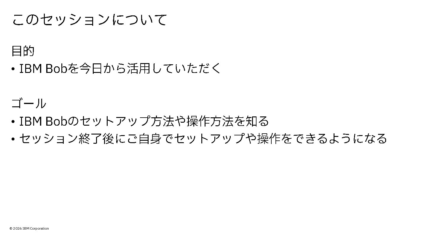 © 2026 IBM Corporation 本日の内容 • IBM Bob の概要やセットアップ・ユースケースをデモ形式でご紹介 ゴール
