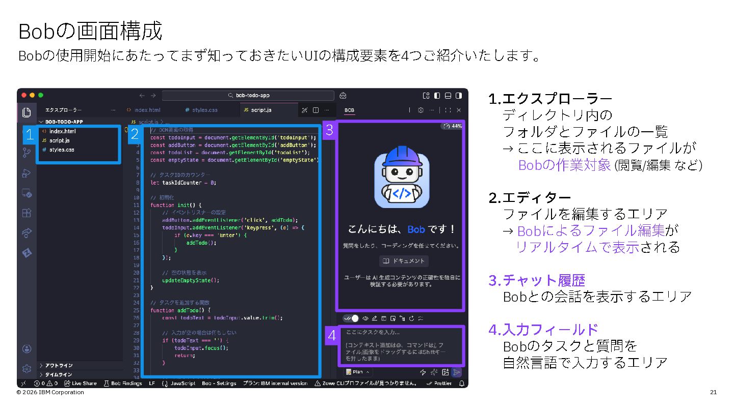 エクスプローラー ディレクトリ内の フォルダとファイルの一覧 → ここに表示されるファイルが Bobの作業対象 (閲覧/編集 など ) 2. エディター ファイルを編集するエリア → Bobによるファイル編集 が リアルタイムで表示 される 3. チャット履歴 Bobとの会話を表示するエリア 4. 入力フィールド Bobのタスクと質問を 自然言語で入力するエリア 2 3 4