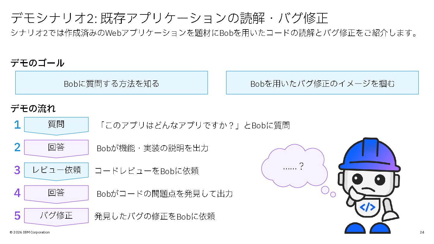 © 2026 IBM Corporation 24 デモシナリオ 2: 既存アプリケーションの読解・バグ修正 シナリオ 2では作成済みのWebアプリケーションを題材に