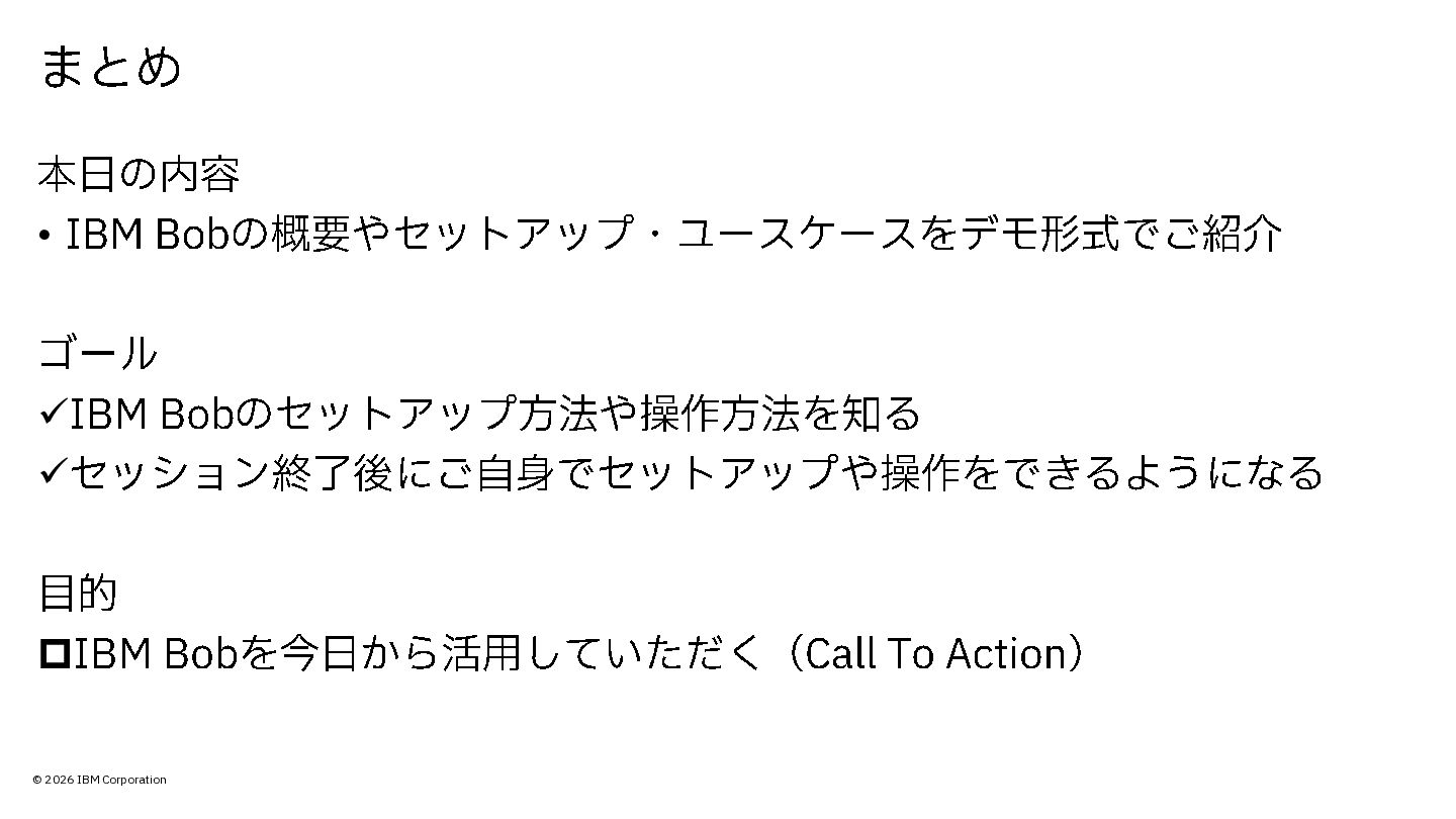 ✓IBM Bob のセットアップ方法や操作方法を知る ✓セッション終了後にご自身でセットアップや操作をできるようになる 目的 IBM Bob を今日から活用していただく( Call To Action ) まとめ