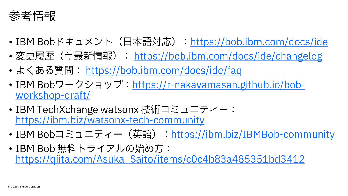 変更履歴( ≒最新情報): https://bob.ibm.com/docs/ide/changelog • よくある質問: https://bob.ibm.com/docs/ide/faq • IBM Bob ワークショップ: https://r -nakayamasan.github.io/bob - workshop -draft/ • IBM TechXchange watsonx 技術コミュニティー: https://ibm.biz/watsonx -tech -community • IBM Bob コミュニティー(英語): https://ibm.biz/ IBMBob -community • IBM Bob 無料トライアルの始め方: https://qiita.com/Asuka_Saito/items/ c0c4b83a485351bd3412 参考情報