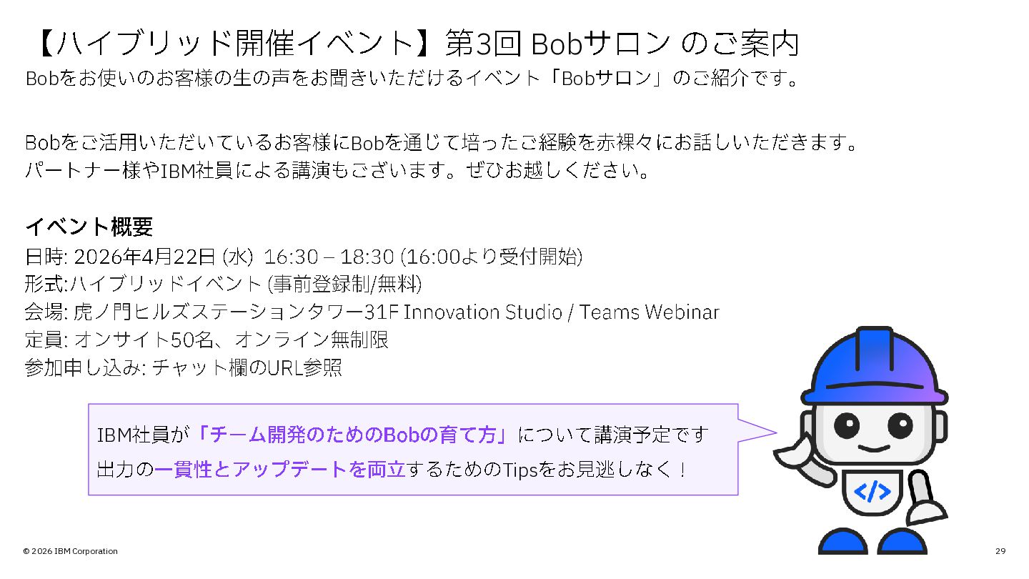のご案内 Bobをお使いのお客様の生の声をお聞きいただけるイベント「 Bobサロン」のご紹介です。 Bob をご活用いただいているお客様に Bobを通じて培ったご経験を赤裸々にお話しいただきます。 パートナー様や IBM社員による講演もございます。ぜひお越しください。 イベント概要 日時: 2026 年4月22 日 (水) 16:30 – 18:30 (16:00 より受付開始 ) 形式:ハイブリッドイベント (事前登録制/無料) 会場: 虎ノ門ヒルズステーションタワー 31F Innovation Studio / Teams Webinar 定員: オンサイト 50 名、オンライン無制限 参加申し込み : チャット欄の URL参照 IBM社員が「チーム開発のための Bob の育て方」 について講演予定です 出力の一貫性とアップデートを両立 するための Tipsをお見逃しなく!