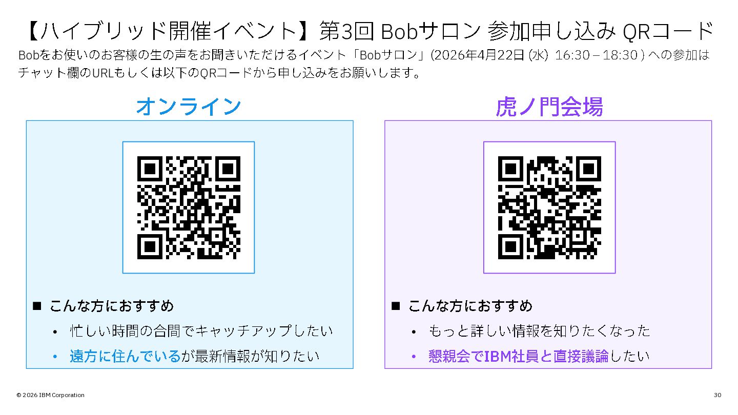 © 2026 IBM Corporation 30 【 ハイブリッド開催イベント 】 第3回 Bobサロン