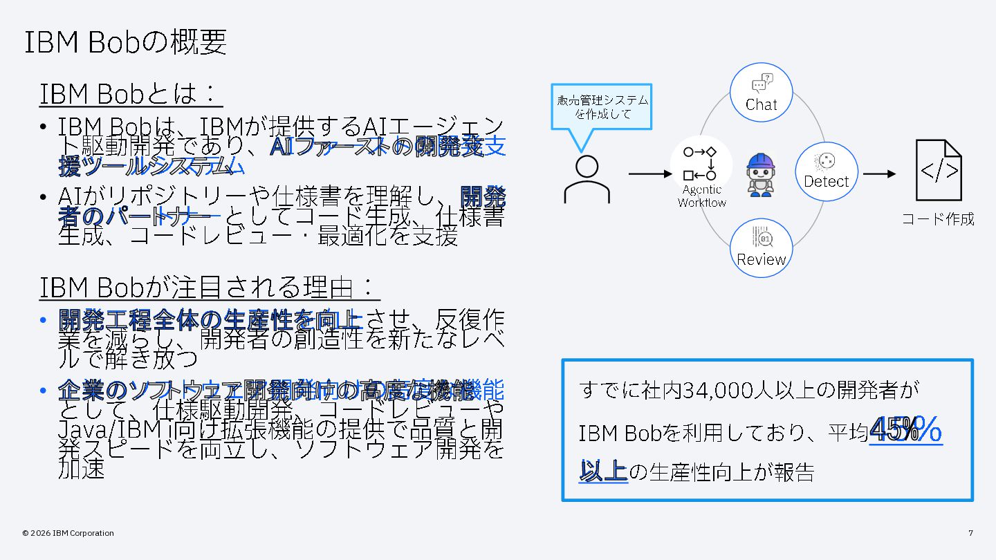 とは: • IBM Bob は、 IBM が提供する AI エージェン ト駆動開発であり、 AI ファーストの開発支 援ツールシステム • AI がリポジトリーや仕様書を理解し、 開発 者のパートナー としてコード生成、仕様書 生成、コードレビュー・最適化を支援 IBM Bob が注目される理由: • 開発工程全体の生産性を向上させ、反復作 業を減らし、開発者の創造性を新たなレベ ルで解き放つ • 企業のソフトウェア開発向けの高度な機能 として、仕様駆動開発、コードレビューや Java/IBM i向け拡張機能の提供で品質と開 発スピードを両立し、ソフトウェア開発を 加速 すでに社内 34 ,000 人以上の開発者が IBM Bob を利用しており、平均 45% 以上の生産性向上が報告 販売管理システム を作成して Chat Detect Review </> コード作成 Agentic Workflow