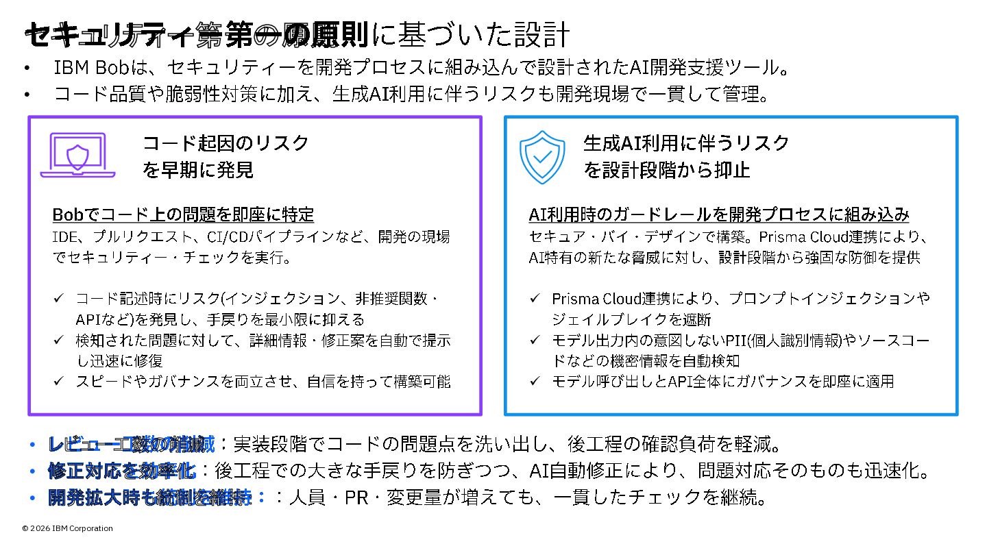 © 2026 IBM Corporation セキュリティー第一の原則 に基づいた設計 • IBM Bob は、セキュリティーを開発プロセスに組み込んで設計された