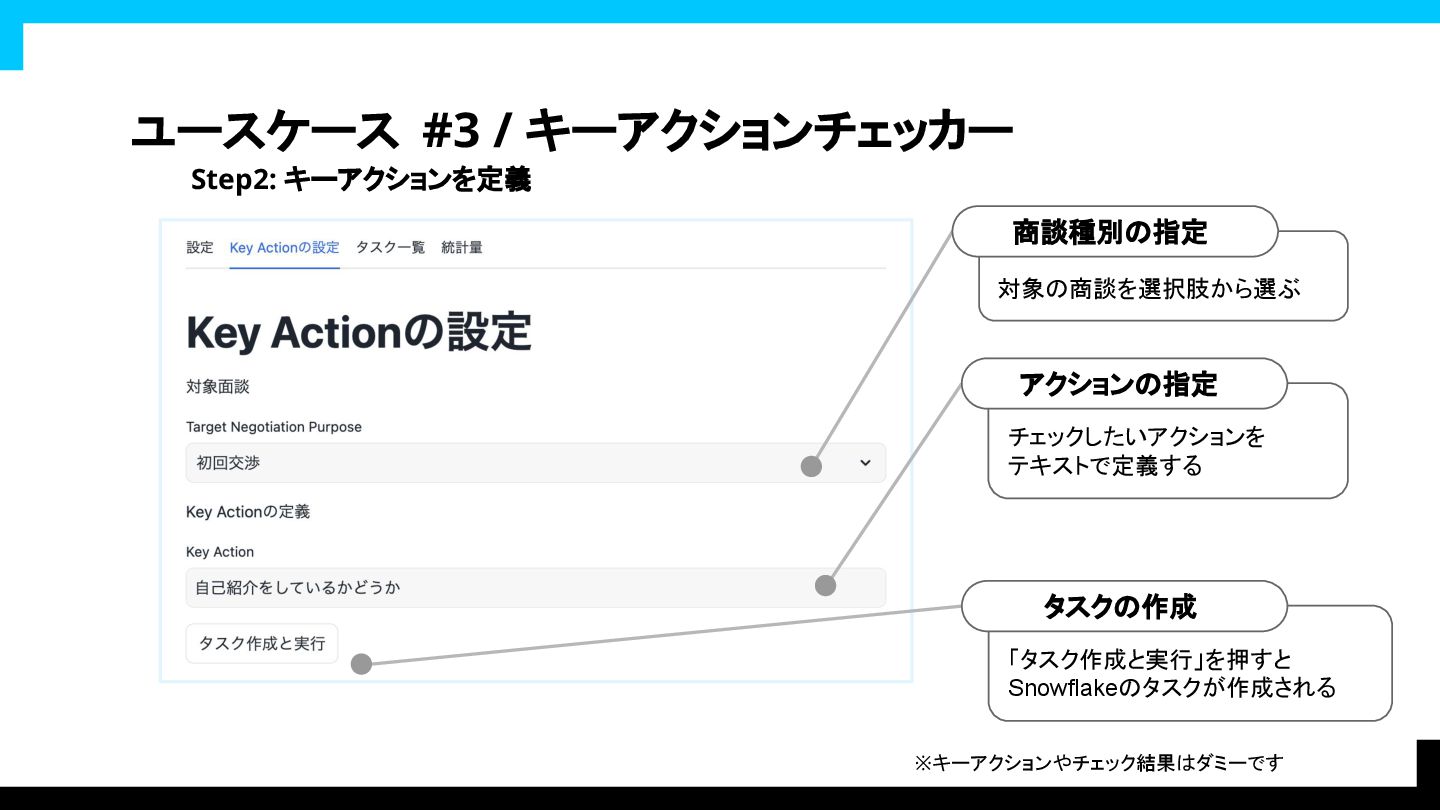 Actionを見つけることが求められていま す。 Key Actionは、営業トークの中で重要な行動や発言を指します。 例えば、自己紹介や商品の説明、顧客のニーズの確認などが含まれます。 あなたは、Transcriptを読み取り、Key Actionが行われているかどうかのフラ グを立てる必要があります。 # 出力フォーマット 以下の通りで「0」か「1」の整数のみ出力してください。それ以外のテキストは 出力しないでください。 - 0: (Key Actionが行われていない) - 1: (Key Actionが行われている) ~~~(略)~~~ select * ,SNOWFLAKE.CORTEX.COMPLETE( 'llama3.1-8b', [{{ 'role': 'user', 'content': concat( '{llm_prompt}', ' # Key Action:', '{key_action}', ' # Transcript:', {input_column_name} ) }}], {{'max_tokens':100}} ):"choices"[0]:"messages" AS key_action_flag_temp from target_table Snowflake Cortexを呼ぶ部分