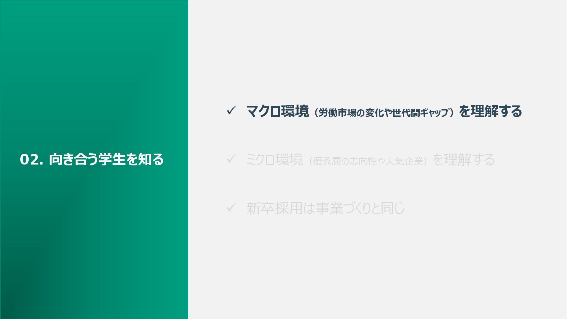 ✓ マクロ環境(労働市場の変化や世代間ギャップ)を理解する ✓ ミクロ環境(優秀層の志向性や人気企業)を理解する ✓ 新卒採用は事業づくりと同じ 02. 向き合う学生を知る