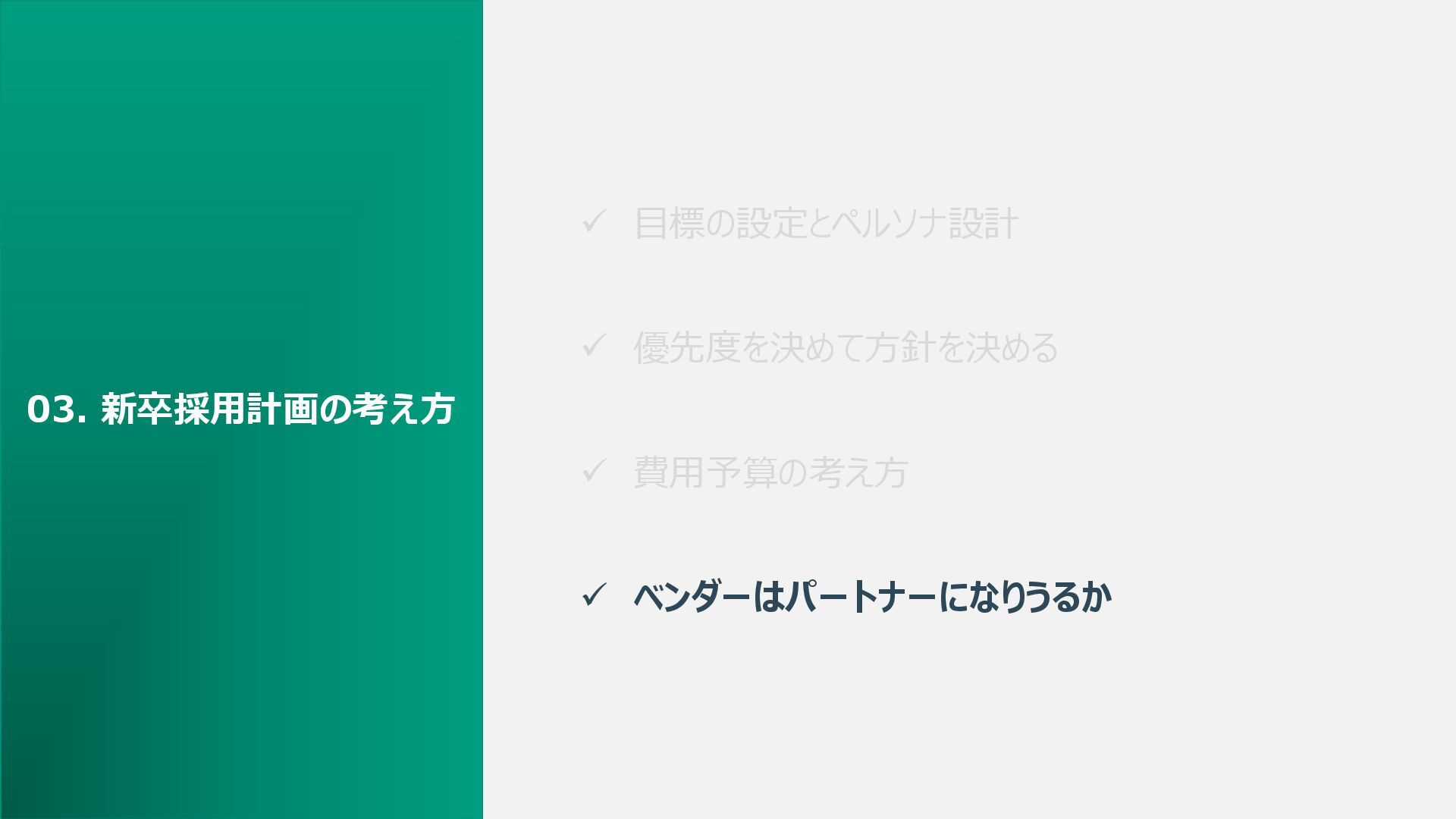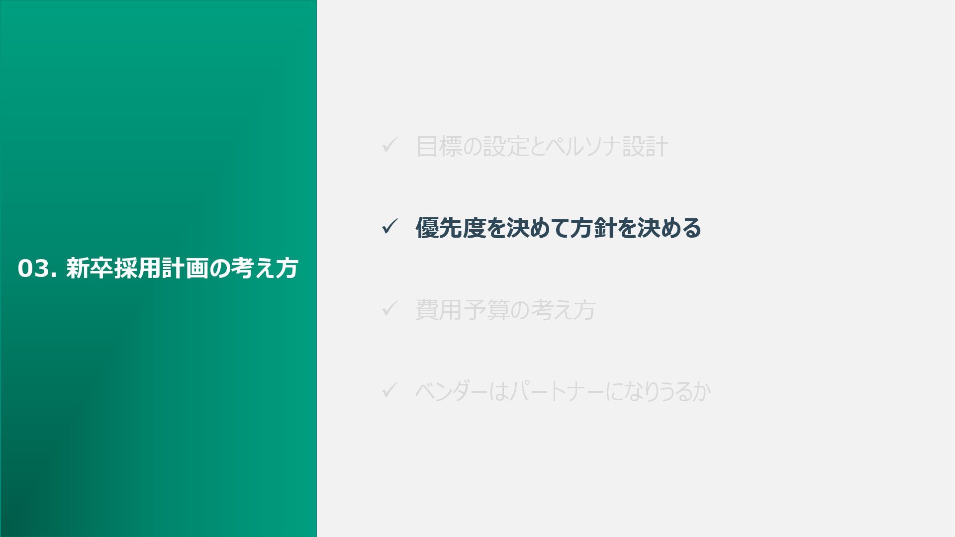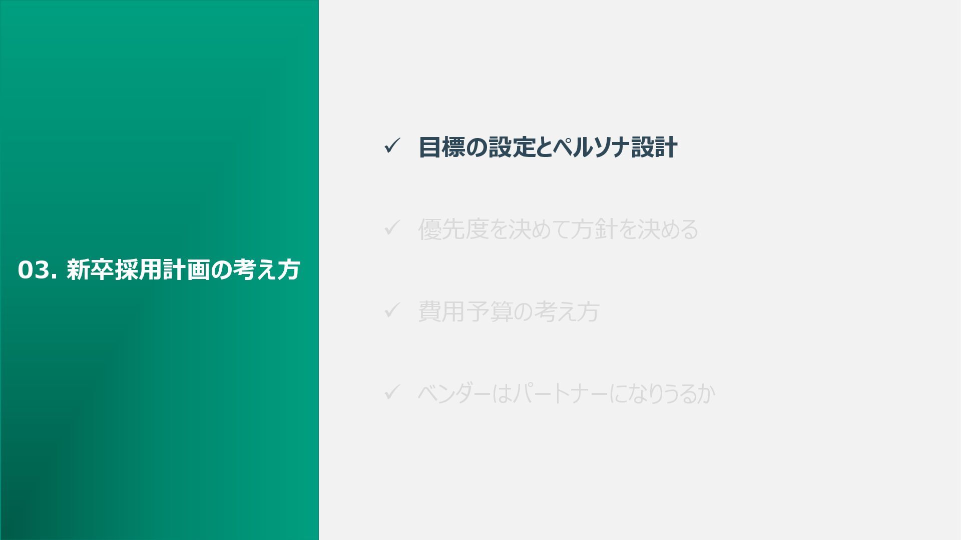 ✓ 目標の設定とペルソナ設計 ✓ 優先度を決めて方針を決める ✓ 費用予算の考え方 ✓ ベンダーはパートナーになりうるか 03. 新卒採用計画の考え方