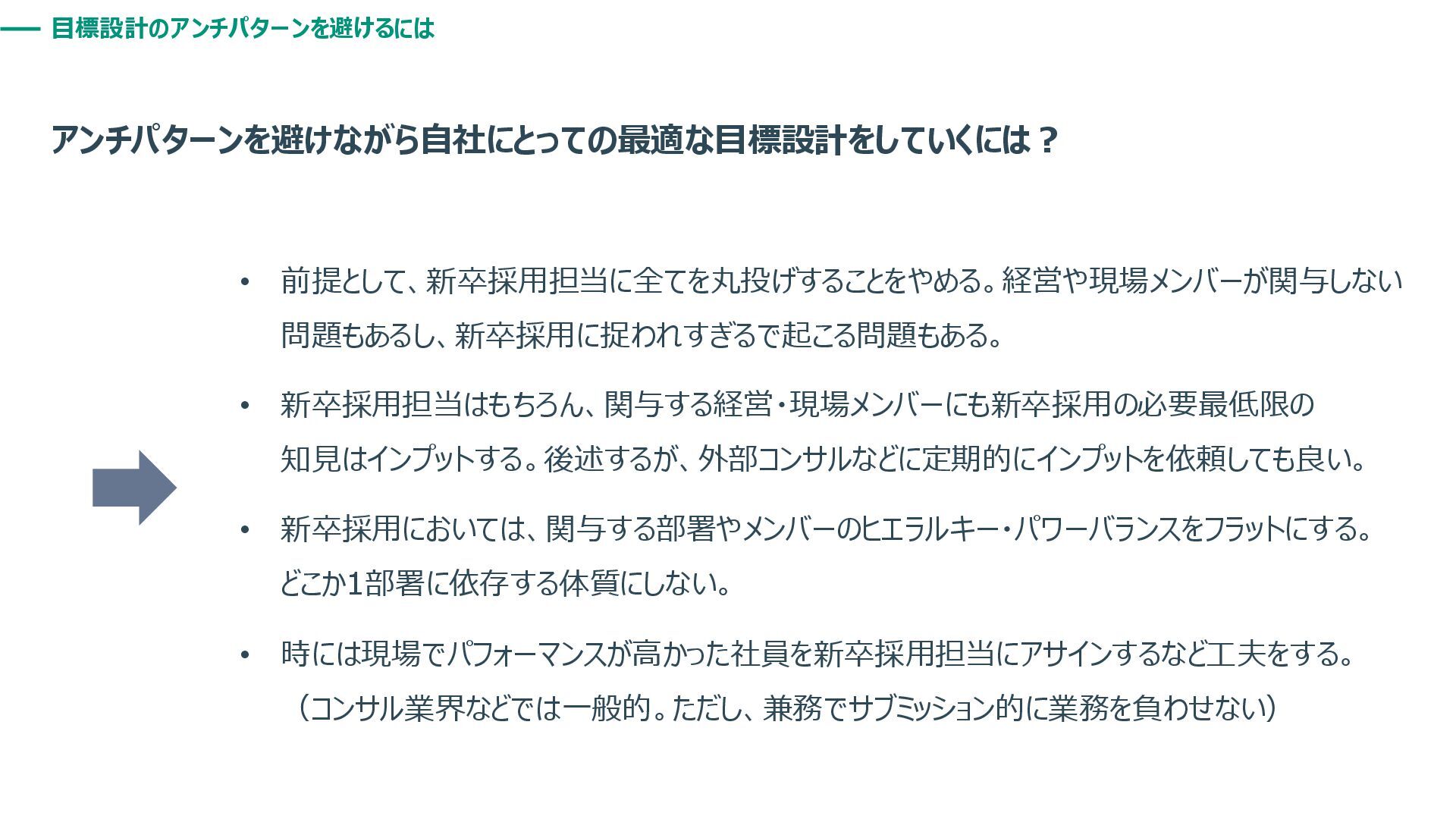 目標設計のアンチパターンを避けるには アンチパターンを避けながら自社にとっての最適な目標設計をしていくには? • 前提として、新卒採用担当に全てを丸投げすることをやめる。経営や現場メンバーが関与しない 問題もあるし、新卒採用に捉われすぎるで起こる問題もある。 • 新卒採用担当はもちろん、関与する経営・現場メンバーにも新卒採用の必要最低限の 知見はインプットする。後述するが、外部コンサルなどに定期的にインプットを依頼しても良い。 • 新卒採用においては、関与する部署やメンバーのヒエラルキー・パワーバランスをフラットにする。