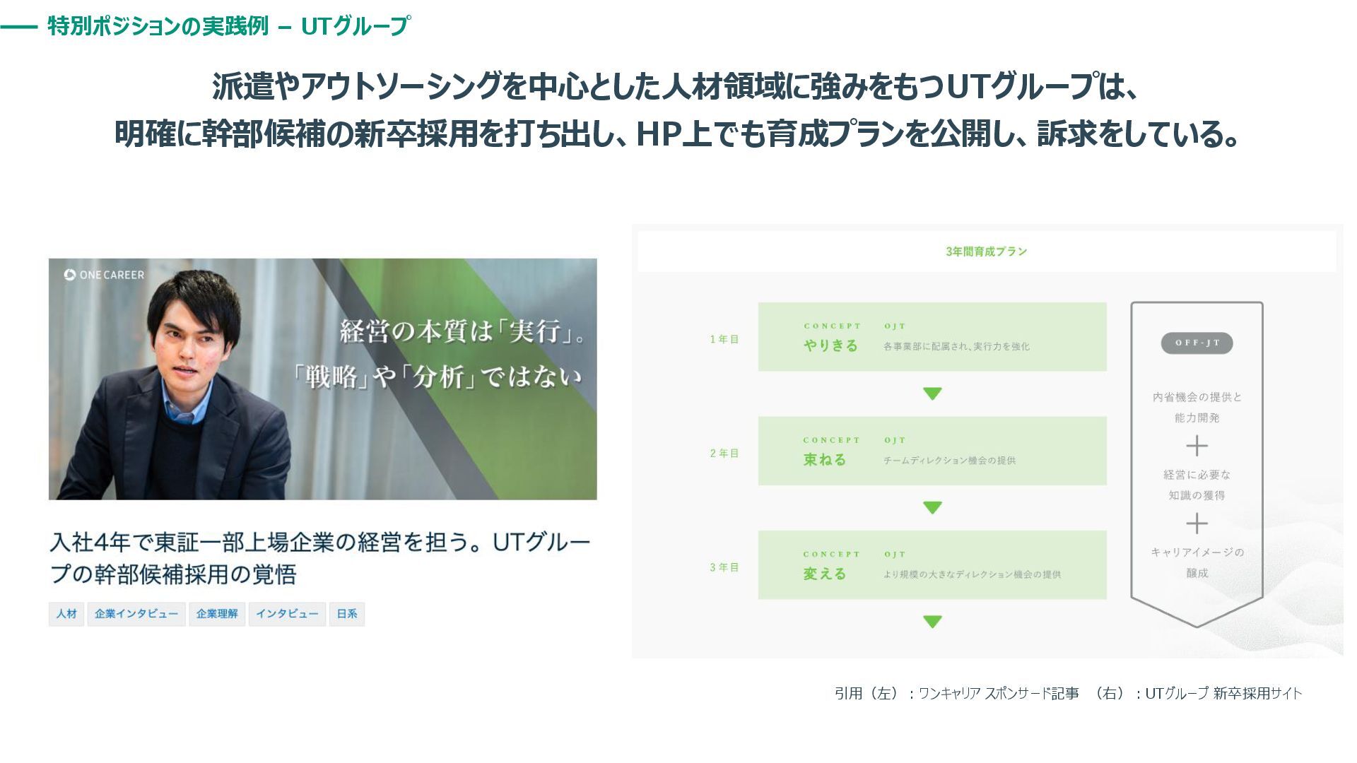 特別ポジションの実践例 – UTグループ 派遣やアウトソーシングを中心とした人材領域に強みをもつUTグループは、 明確に幹部候補の新卒採用を打ち出し、HP上でも育成プランを公開し、訴求をしている。 引用(左):ワンキャリア スポンサード記事 (右):UTグループ 新卒採用サイト