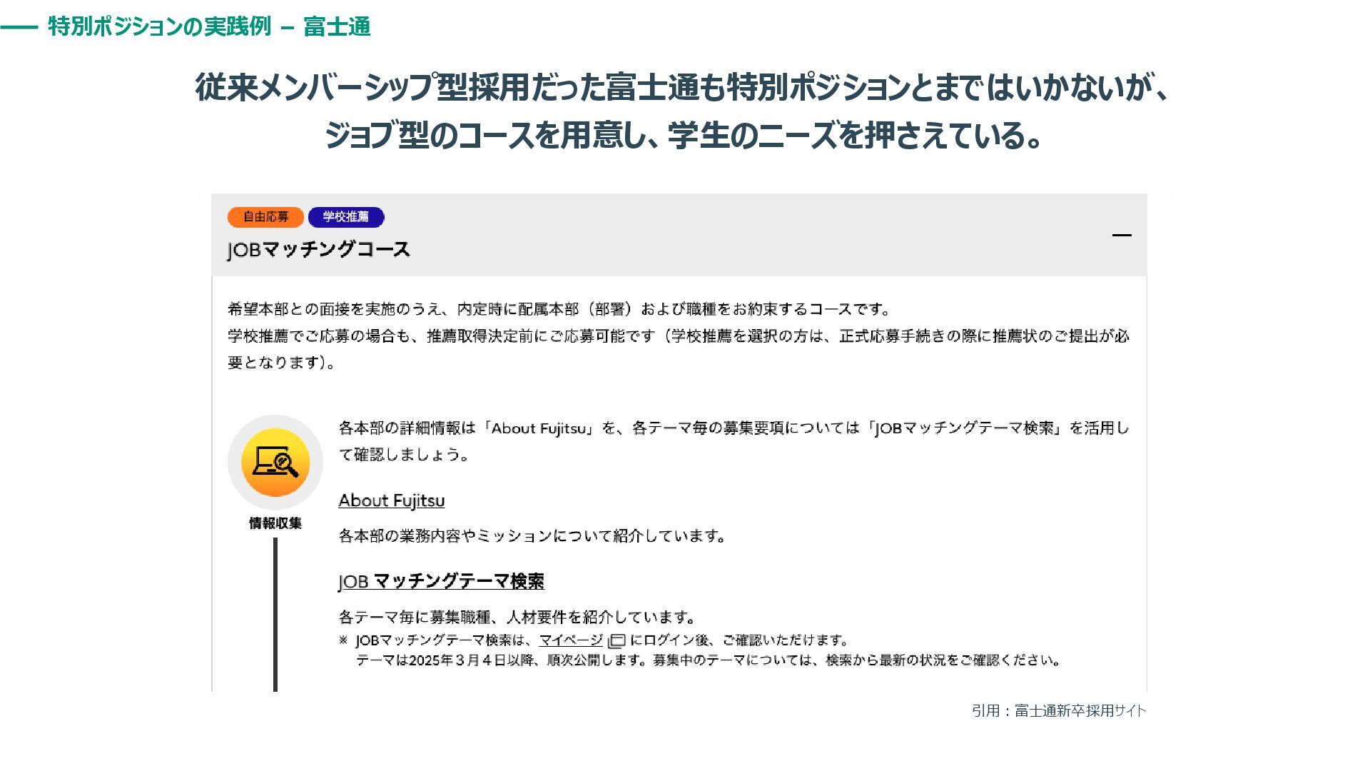 特別ポジションの実践例 – 富士通 従来メンバーシップ型採用だった富士通も特別ポジションとまではいかないが、 ジョブ型のコースを用意し、学生のニーズを押さえている。 引用:富士通新卒採用サイト