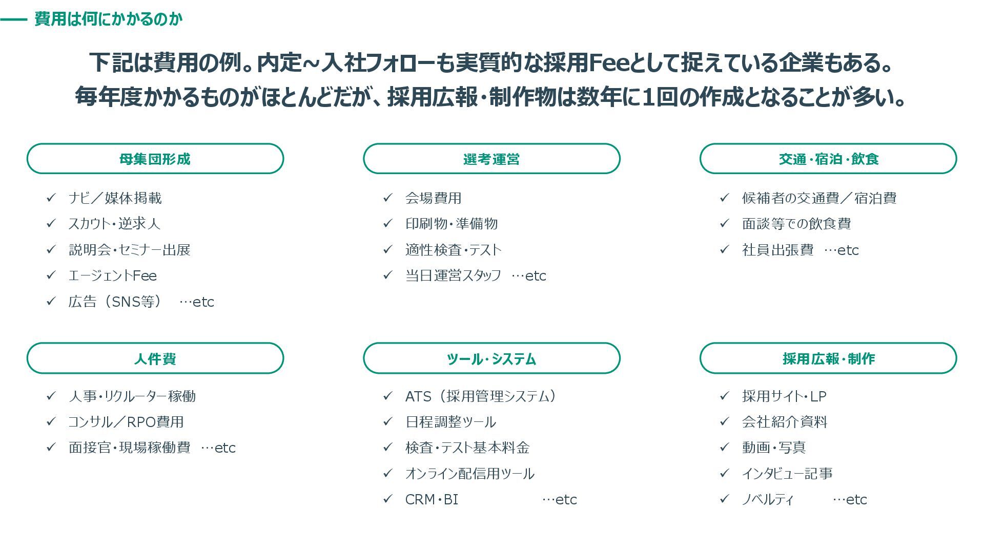 費用は何にかかるのか 下記は費用の例。内定~入社フォローも実質的な採用Feeとして捉えている企業もある。 毎年度かかるものがほとんどだが、採用広報・制作物は数年に1回の作成となることが多い。 母集団形成 選考運営 交通・宿泊・飲食 人件費 ツール・システム 採用広報・制作 ✓