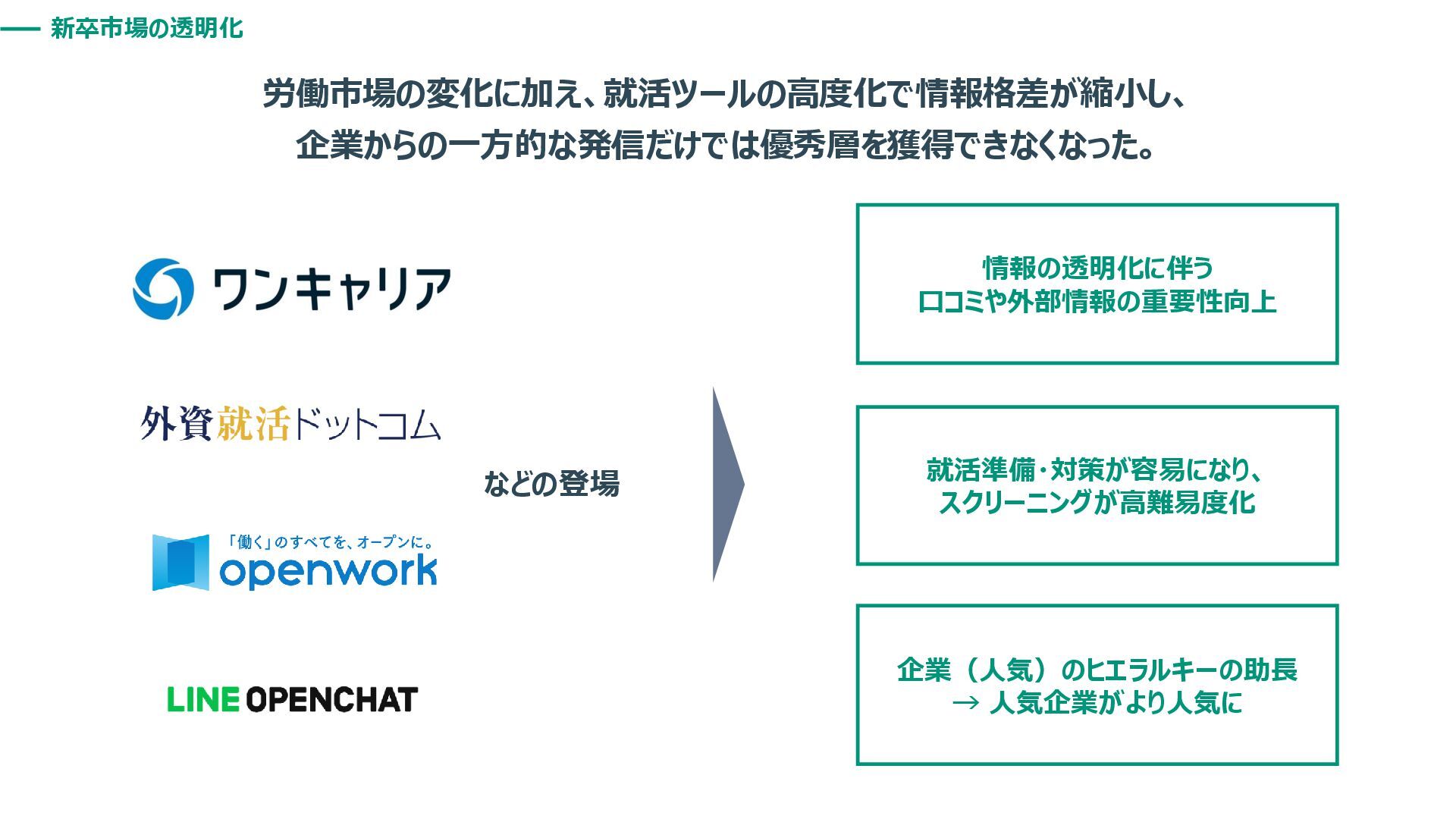 新卒市場の透明化 労働市場の変化に加え、就活ツールの高度化で情報格差が縮小し、 企業からの一方的な発信だけでは優秀層を獲得できなくなった。 などの登場 情報の透明化に伴う 口コミや外部情報の重要性向上 就活準備・対策が容易になり、 スクリーニングが高難易度化 企業(人気)のヒエラルキーの助長 →