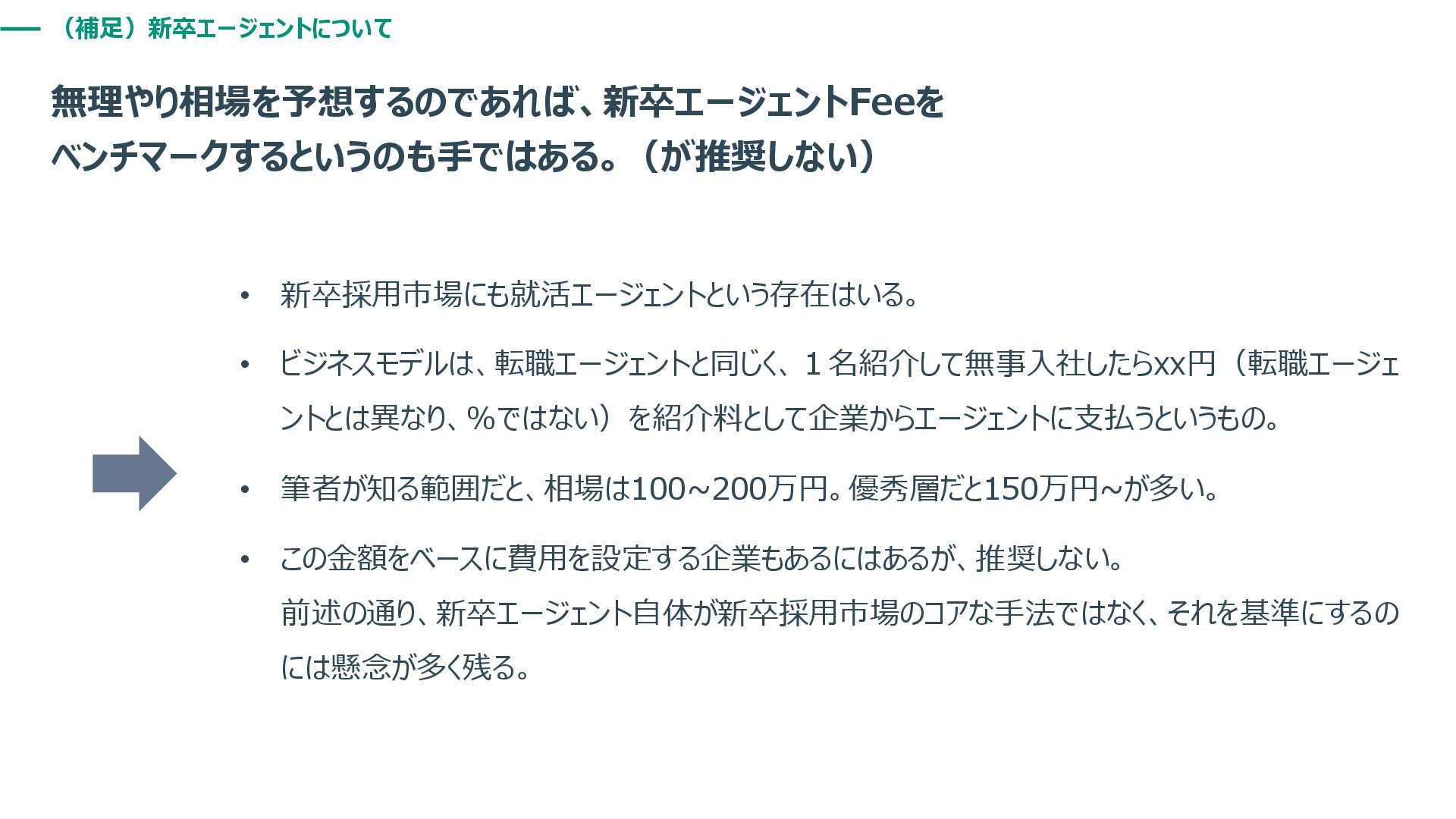 (補足)新卒エージェントについて 無理やり相場を予想するのであれば、新卒エージェントFeeを ベンチマークするというのも手ではある。(が推奨しない) • 新卒採用市場にも就活エージェントという存在はいる。 • ビジネスモデルは、転職エージェントと同じく、1名紹介して無事入社したらxx円(転職エージェ ントとは異なり、%ではない)を紹介料として企業からエージェントに支払うというもの。 • 筆者が知る範囲だと、相場は100~200万円。優秀層だと150万円~が多い。