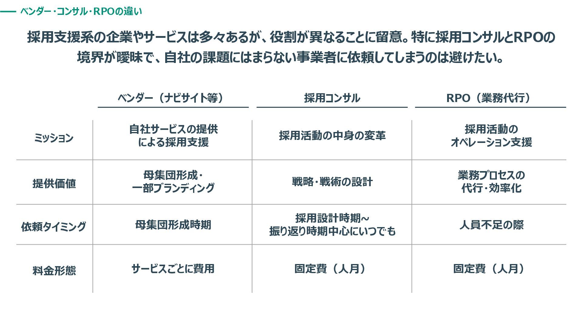 ベンダー・コンサル・RPOの違い 採用支援系の企業やサービスは多々あるが、役割が異なることに留意。特に採用コンサルとRPOの 境界が曖昧で、自社の課題にはまらない事業者に依頼してしまうのは避けたい。 採用コンサル RPO(業務代行) ベンダー(ナビサイト等) ミッション 提供価値 依頼タイミング 料金形態