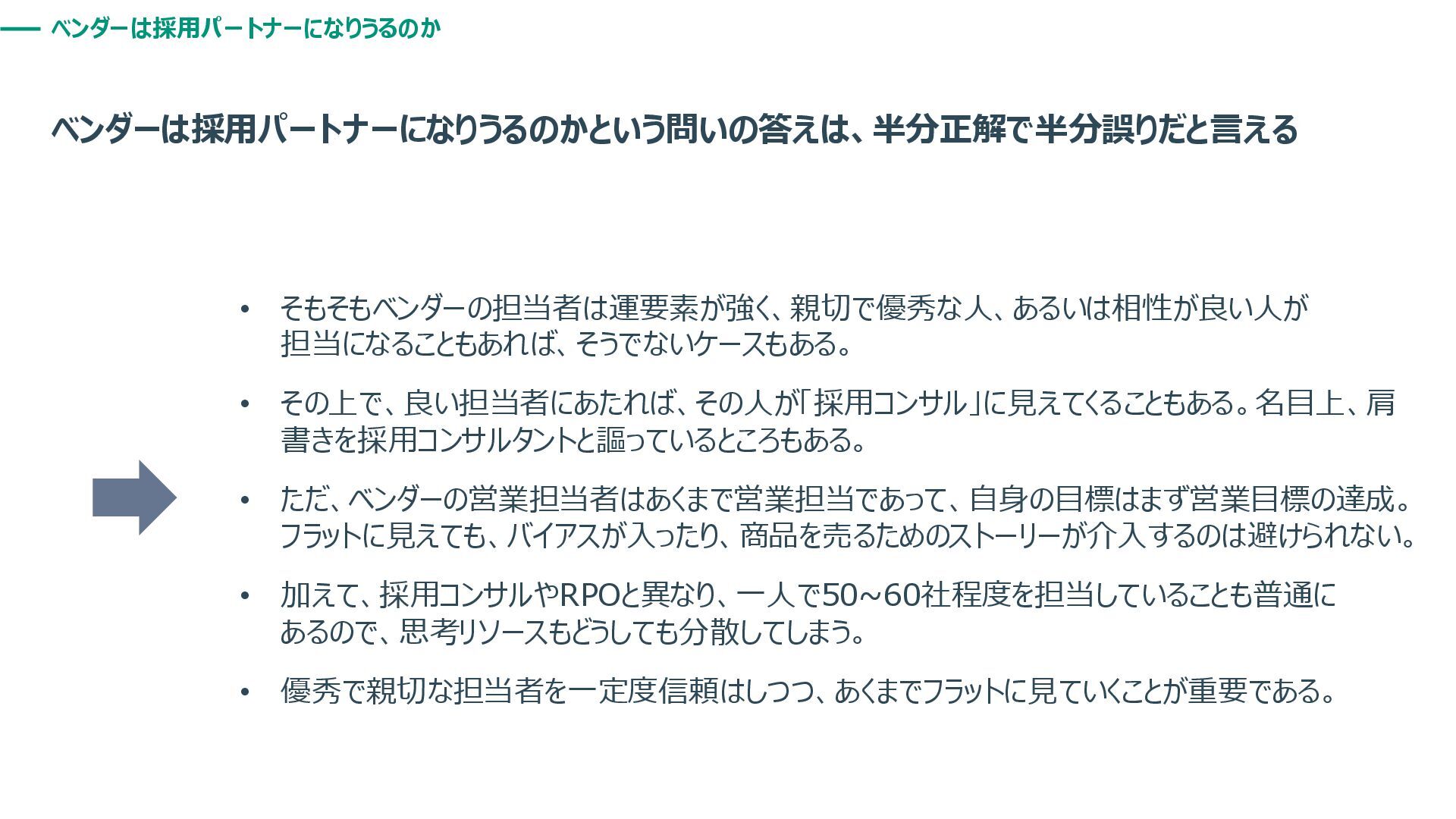 ベンダーは採用パートナーになりうるのか ベンダーは採用パートナーになりうるのかという問いの答えは、半分正解で半分誤りだと言える • そもそもベンダーの担当者は運要素が強く、親切で優秀な人、あるいは相性が良い人が 担当になることもあれば、そうでないケースもある。 • その上で、良い担当者にあたれば、その人が「採用コンサル」に見えてくることもある。名目上、肩 書きを採用コンサルタントと謳っているところもある。 • ただ、ベンダーの営業担当者はあくまで営業担当であって、自身の目標はまず営業目標の達成。