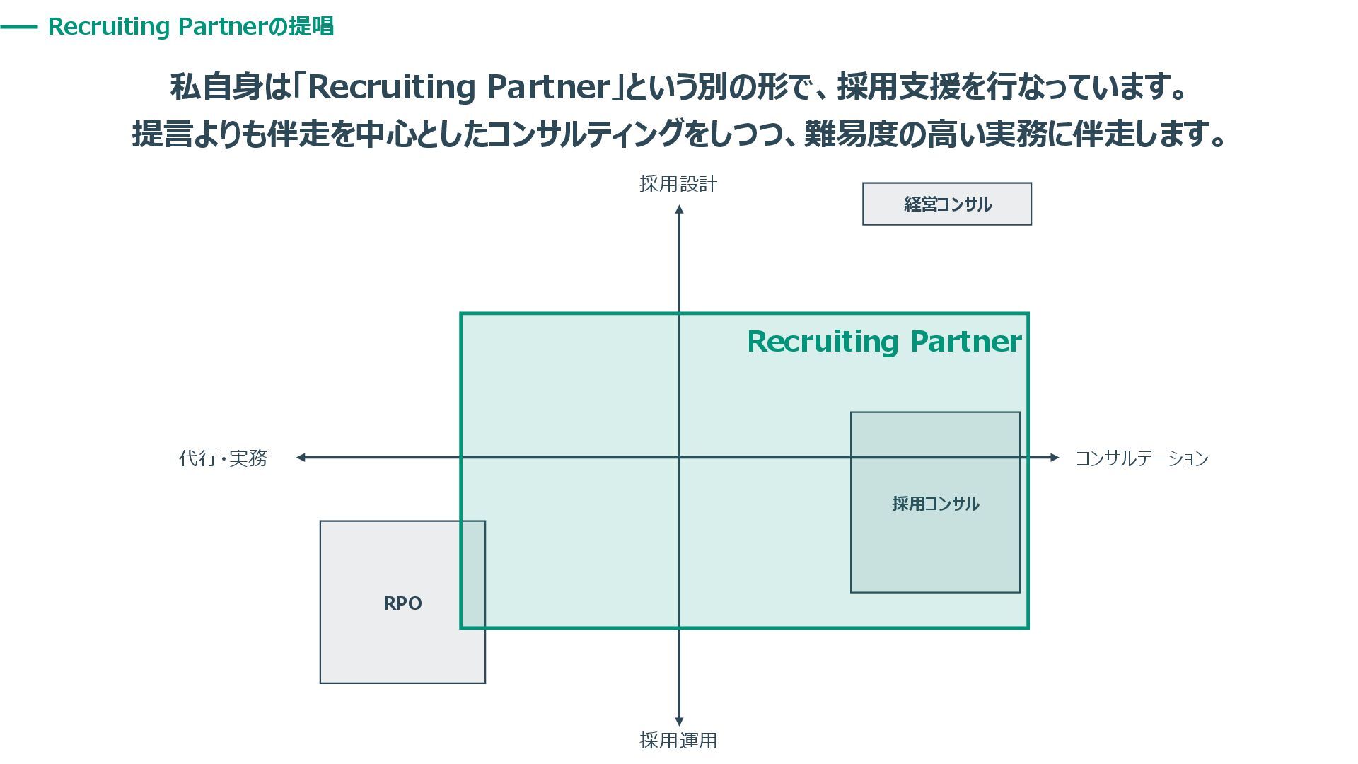 Recruiting Partnerの提唱 私自身は「Recruiting Partner」という別の形で、採用支援を行なっています。 提言よりも伴走を中心としたコンサルティングをしつつ、難易度の高い実務に伴走します。 経営コンサル 採用コンサル RPO 採用設計 コンサルテーション
