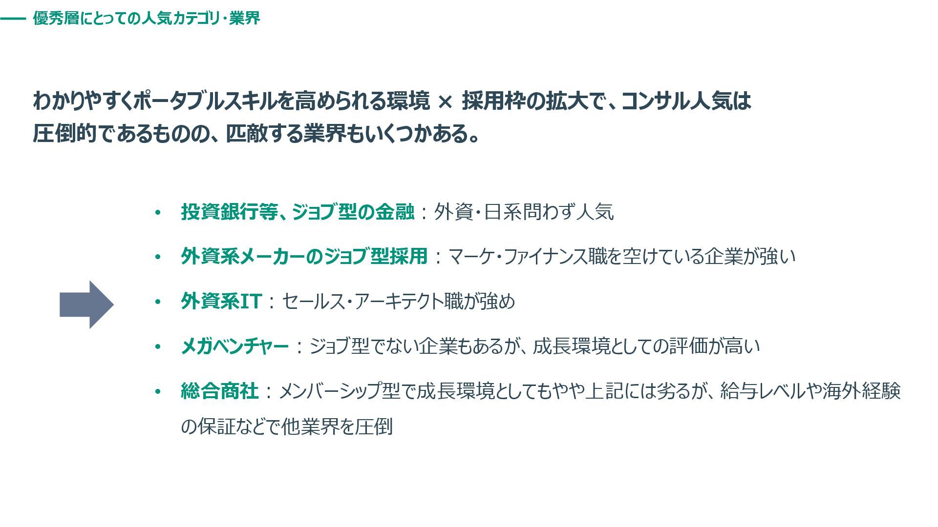 優秀層にとっての人気カテゴリ・業界 わかりやすくポータブルスキルを高められる環境 × 採用枠の拡大で、コンサル人気は 圧倒的であるものの、匹敵する業界もいくつかある。 • 投資銀行等、ジョブ型の金融:外資・日系問わず人気 • 外資系メーカーのジョブ型採用:マーケ・ファイナンス職を空けている企業が強い •