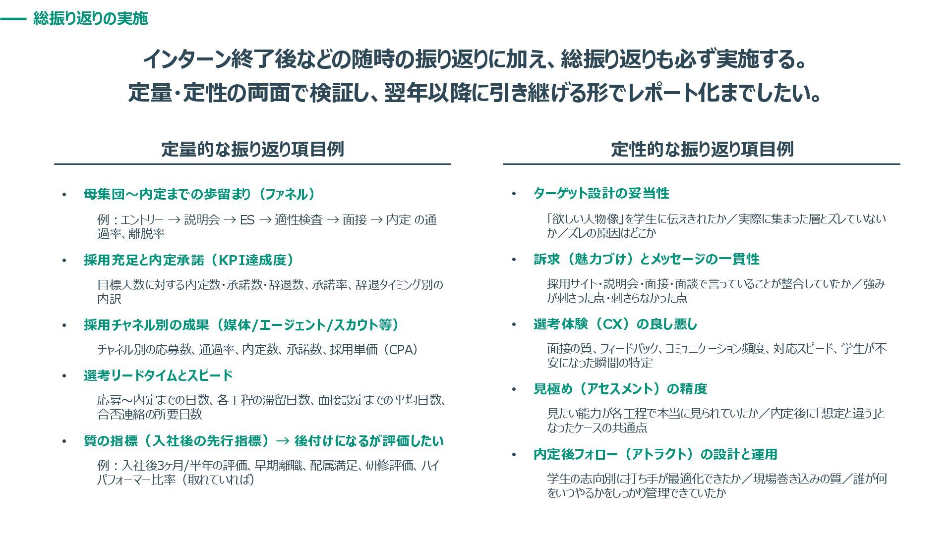 総振り返りの実施 インターン終了後などの随時の振り返りに加え、総振り返りも必ず実施する。 定量・定性の両面で検証し、翌年以降に引き継げる形でレポート化までしたい。 定量的な振り返り項目例 定性的な振り返り項目例 • 母集団〜内定までの歩留まり(ファネル) 例:エントリー → 説明会