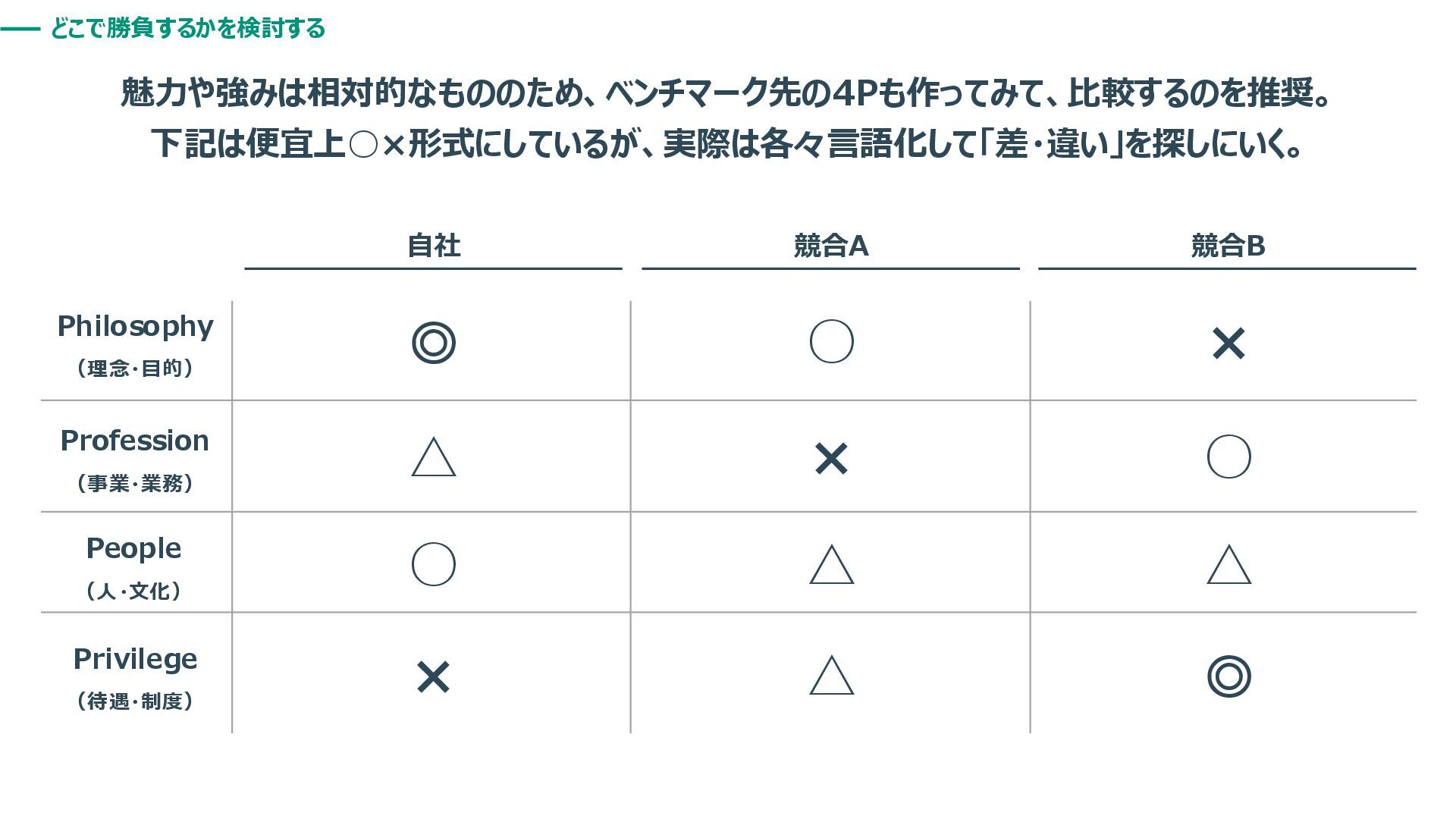 どこで勝負するかを検討する 魅力や強みは相対的なもののため、ベンチマーク先の4Pも作ってみて、比較するのを推奨。 下記は便宜上◦×形式にしているが、実際は各々言語化して「差・違い」を探しにいく。 競合A 競合B 自社 Philosophy (理念・目的) Profession (事業・業務)