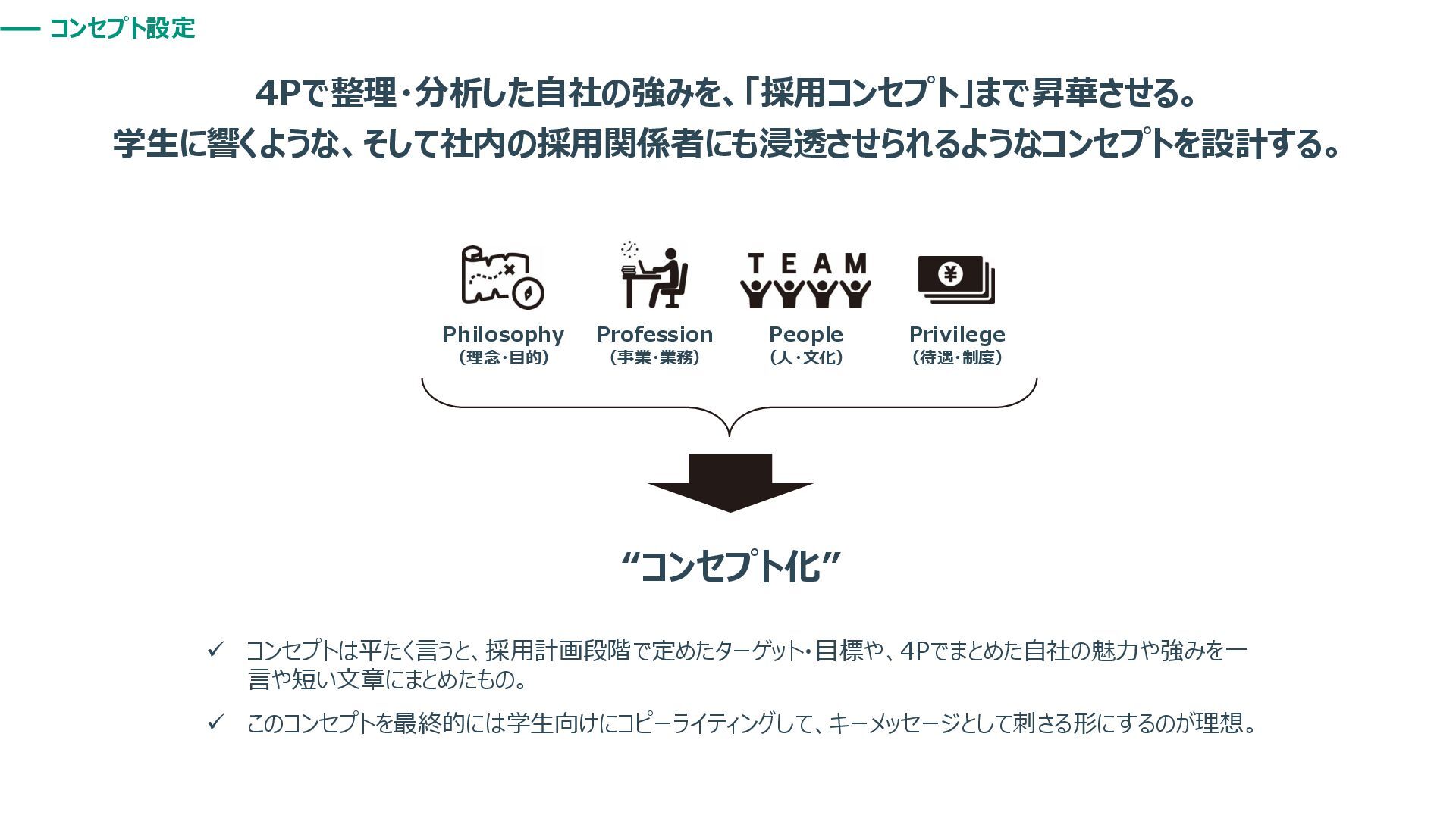 コンセプト設定 4Pで整理・分析した自社の強みを、「採用コンセプト」まで昇華させる。 学生に響くような、そして社内の採用関係者にも浸透させられるようなコンセプトを設計する。 Philosophy (理念・目的) Profession (事業・業務) People (人・文化) Privilege
