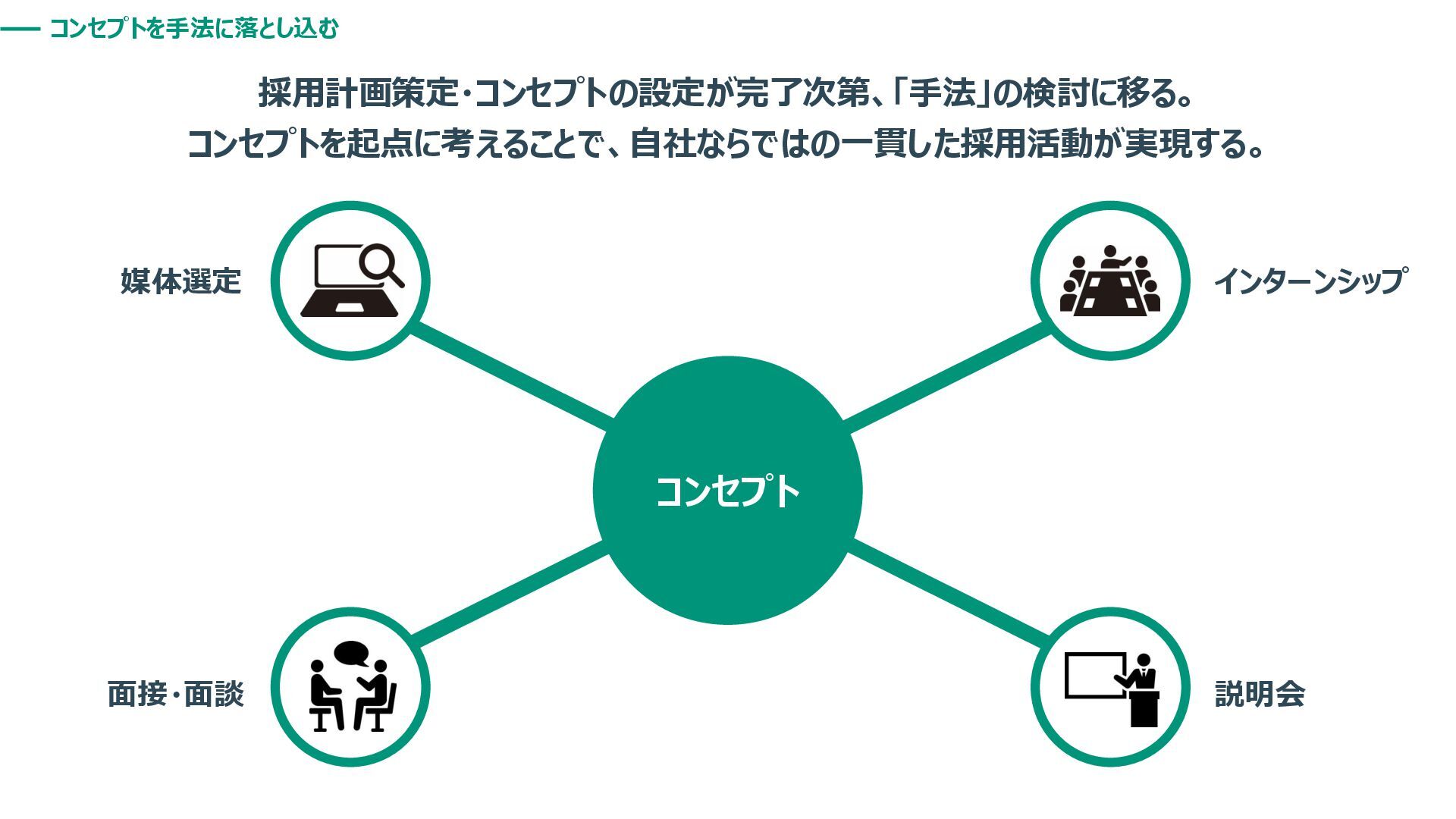 コンセプトを手法に落とし込む コンセプト 面接・面談 説明会 インターンシップ 媒体選定 採用計画策定・コンセプトの設定が完了次第、「手法」の検討に移る。 コンセプトを起点に考えることで、自社ならではの一貫した採用活動が実現する。