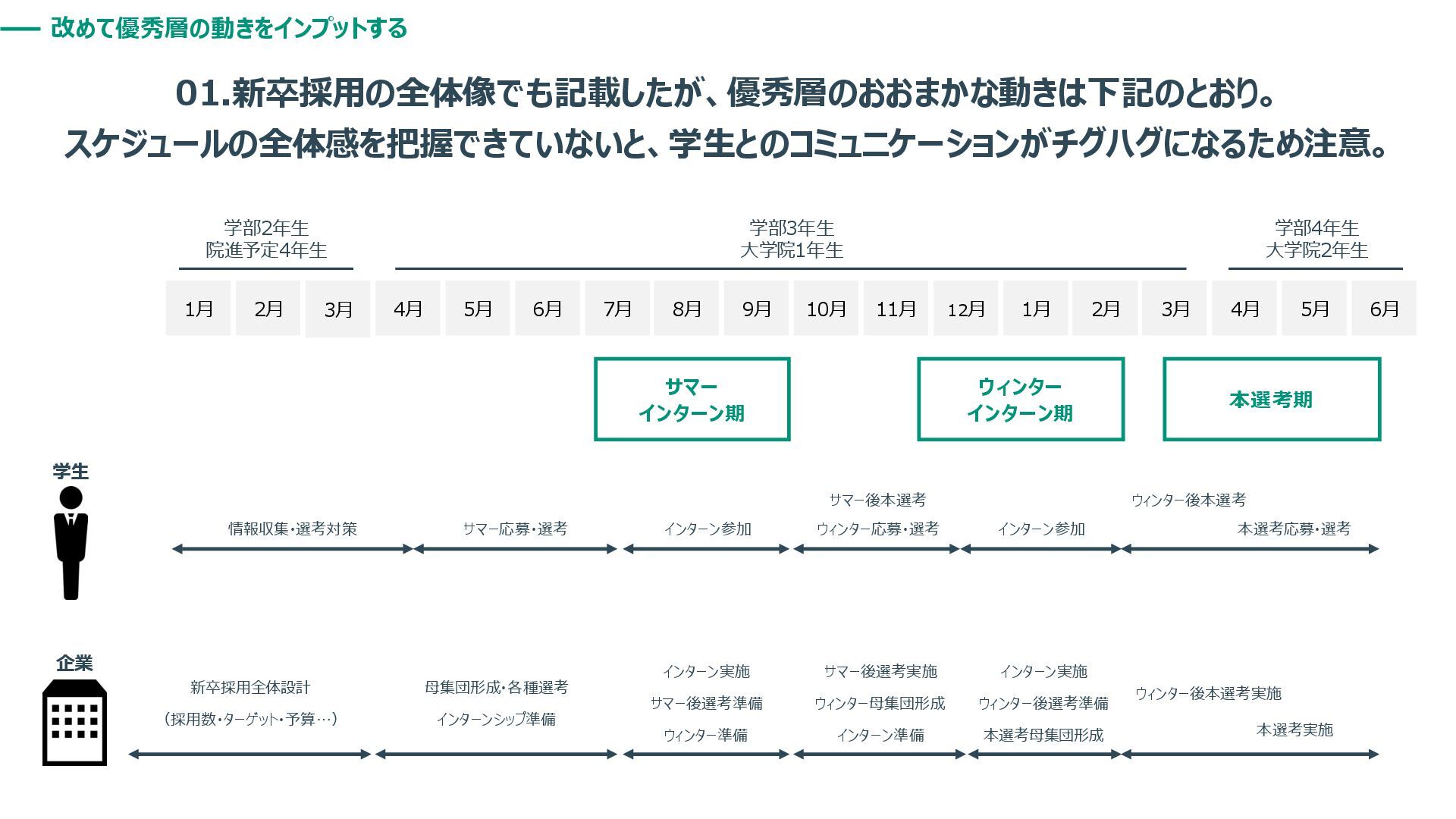 6月 7月 8月 9月 10月 11月 12月 1月 2月 3月 4月 5月 6月 学部2年生 院進予定4年生 学部3年生 大学院1年生 学部4年生 大学院2年生 新卒採用全体設計 (採用数・ターゲット・予算…) 情報収集・選考対策 サマー応募・選考 サマー インターン期 ウィンター インターン期 本選考期 インターン参加 ウィンター応募・選考 サマー後本選考 インターン参加 本選考応募・選考 ウィンター後本選考 母集団形成・各種選考 インターンシップ準備 インターン実施 サマー後選考準備 ウィンター準備 サマー後選考実施 ウィンター母集団形成 インターン準備 インターン実施 ウィンター後選考準備 本選考母集団形成 本選考実施 ウィンター後本選考実施
