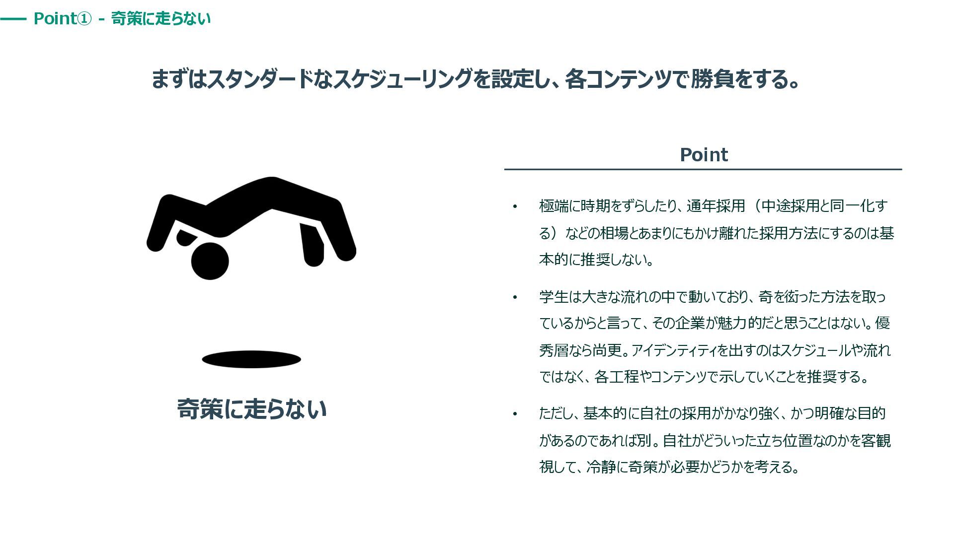 Point① - 奇策に走らない まずはスタンダードなスケジューリングを設定し、各コンテンツで勝負をする。 • 極端に時期をずらしたり、通年採用(中途採用と同一化す る)などの相場とあまりにもかけ離れた採用方法にするのは基 本的に推奨しない。 • 学生は大きな流れの中で動いており、奇を衒った方法を取っ