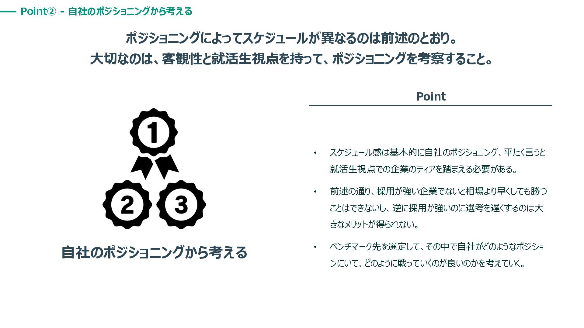 Point② - 自社のポジショニングから考える ポジショニングによってスケジュールが異なるのは前述のとおり。 大切なのは、客観性と就活生視点を持って、ポジショニングを考察すること。 Point 自社のポジショニングから考える • スケジュール感は基本的に自社のポジショニング、平たく言うと 就活生視点での企業のティアを踏まえる必要がある。