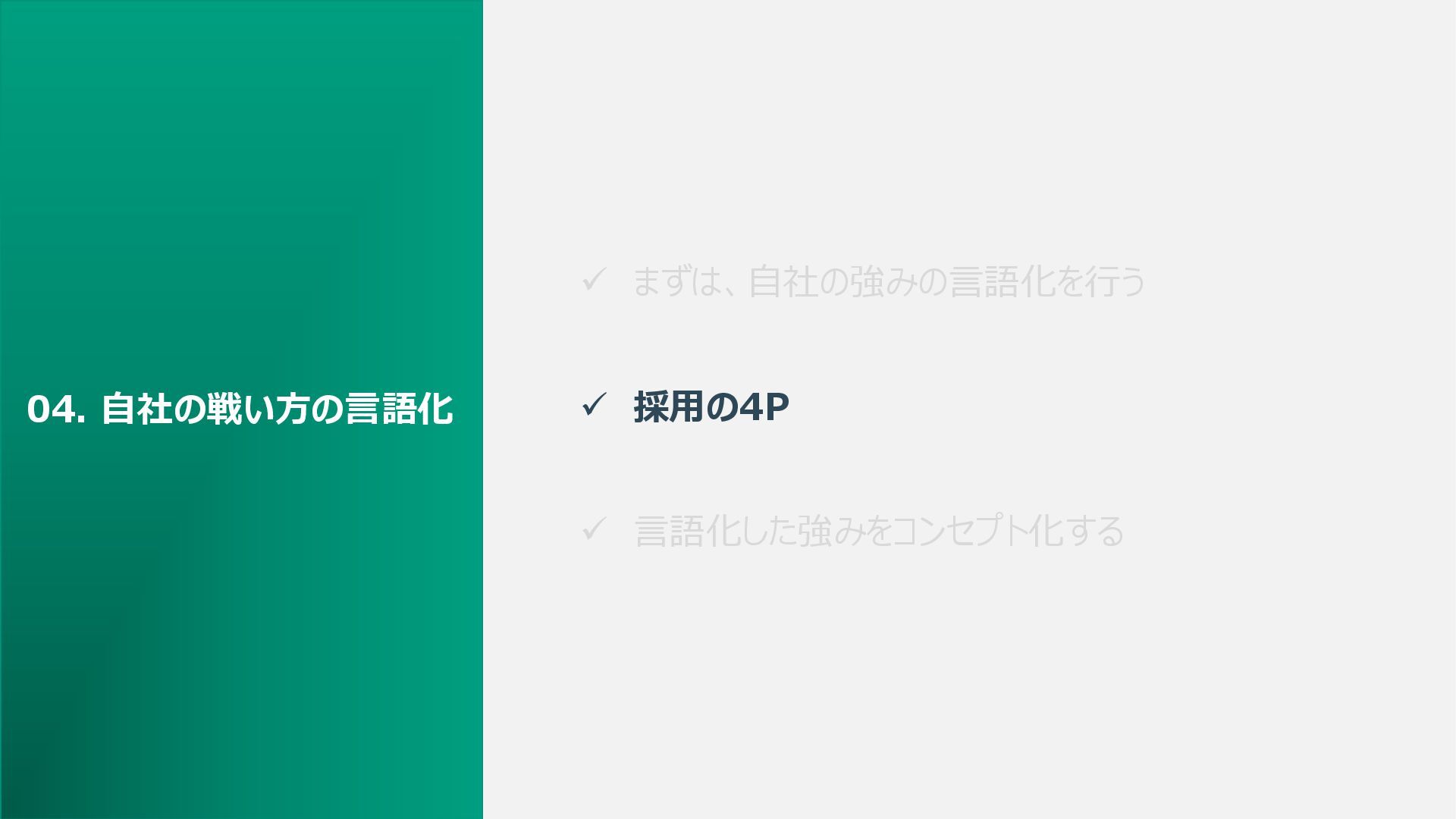 ✓ まずは、自社の強みの言語化を行う ✓ 採用の4P ✓ 言語化した強みをコンセプト化する 04. 自社の戦い方の言語化