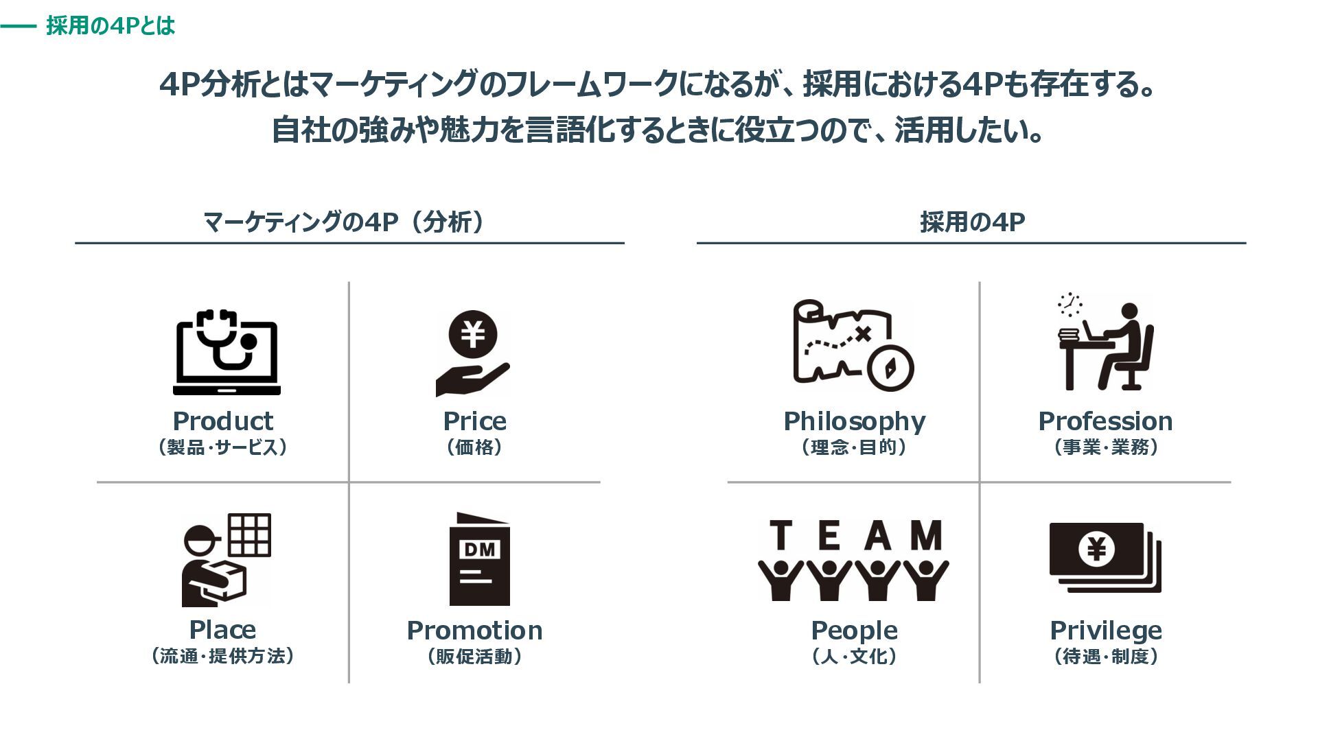 (待遇・制度) Product (製品・サービス) Price (価格) Place (流通・提供方法) Promotion (販促活動) 4P分析とはマーケティングのフレームワークになるが、採用における4Pも存在する。 自社の強みや魅力を言語化するときに役立つので、活用したい。
