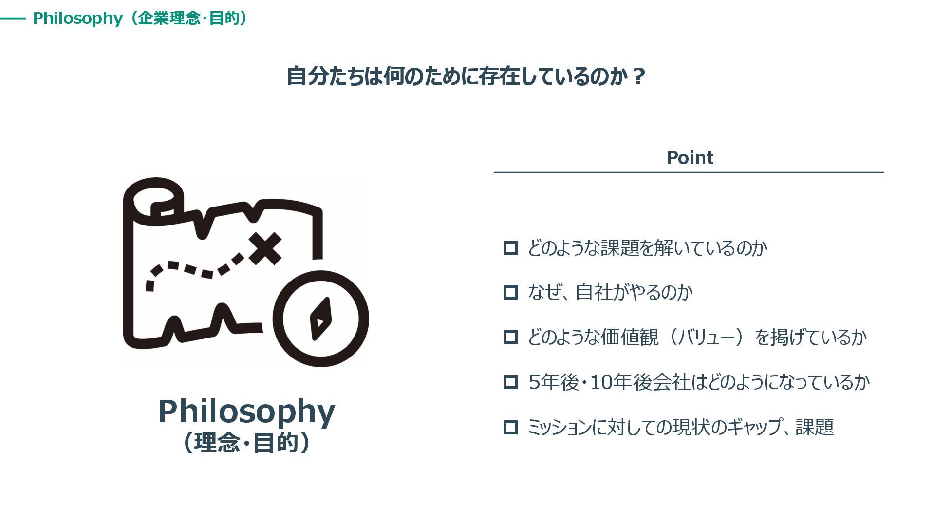 Philosophy(企業理念・目的) 自分たちは何のために存在しているのか? Philosophy (理念・目的) どのような課題を解いているのか なぜ、自社がやるのか どのような価値観(バリュー)を掲げているか