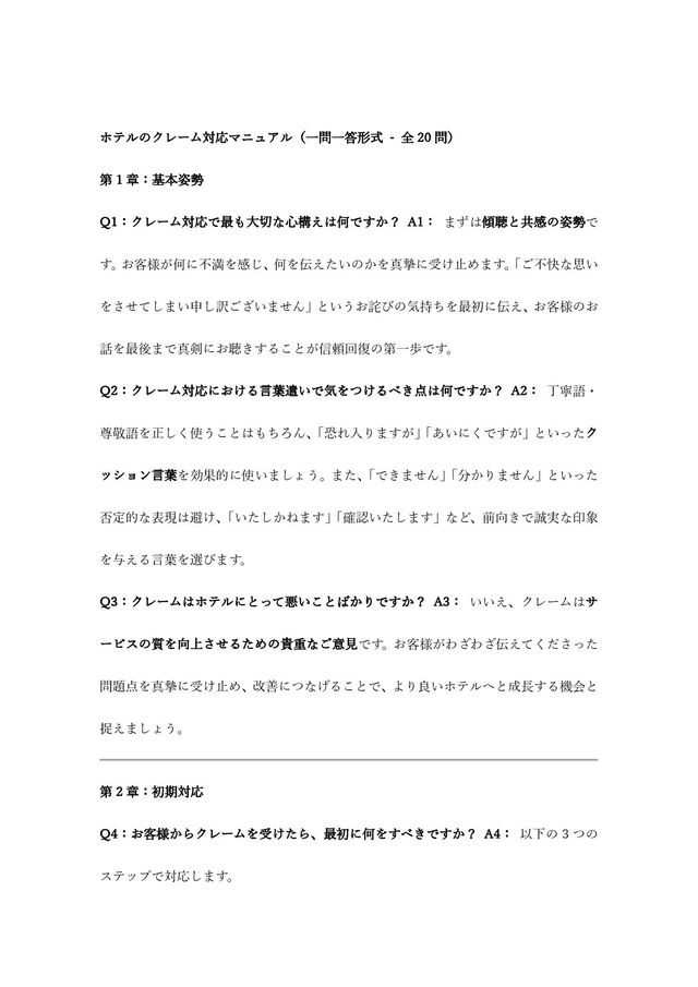 まずは傾聴と共感の姿勢で す。お客様が何に不満を感じ、何を伝えたいのかを真摯に受け止めます。 「ご不快な思い をさせてしまい申し訳ございません」というお詫びの気持ちを最初に伝え、お客様のお 話を最後まで真剣にお聴きすることが信頼回復の第一歩です。 Q2:クレーム対応における言葉遣いで気をつけるべき点は何ですか? A2: 丁寧語・ 尊敬語を正しく使うことはもちろん、 「恐れ入りますが」 「あいにくですが」といったク ッション言葉を効果的に使いましょう。また、 「できません」 「分かりません」といった 否定的な表現は避け、 「いたしかねます」 「確認いたします」など、前向きで誠実な印象 を与える言葉を選びます。 Q3:クレームはホテルにとって悪いことばかりですか? A3: いいえ、クレームはサ ービスの質を向上させるための貴重なご意見です。お客様がわざわざ伝えてくださった 問題点を真摯に受け止め、改善につなげることで、より良いホテルへと成長する機会と 捉えましょう。 第 2 章:初期対応 Q4:お客様からクレームを受けたら、最初に何をすべきですか? A4: 以下の 3 つの ステップで対応します。