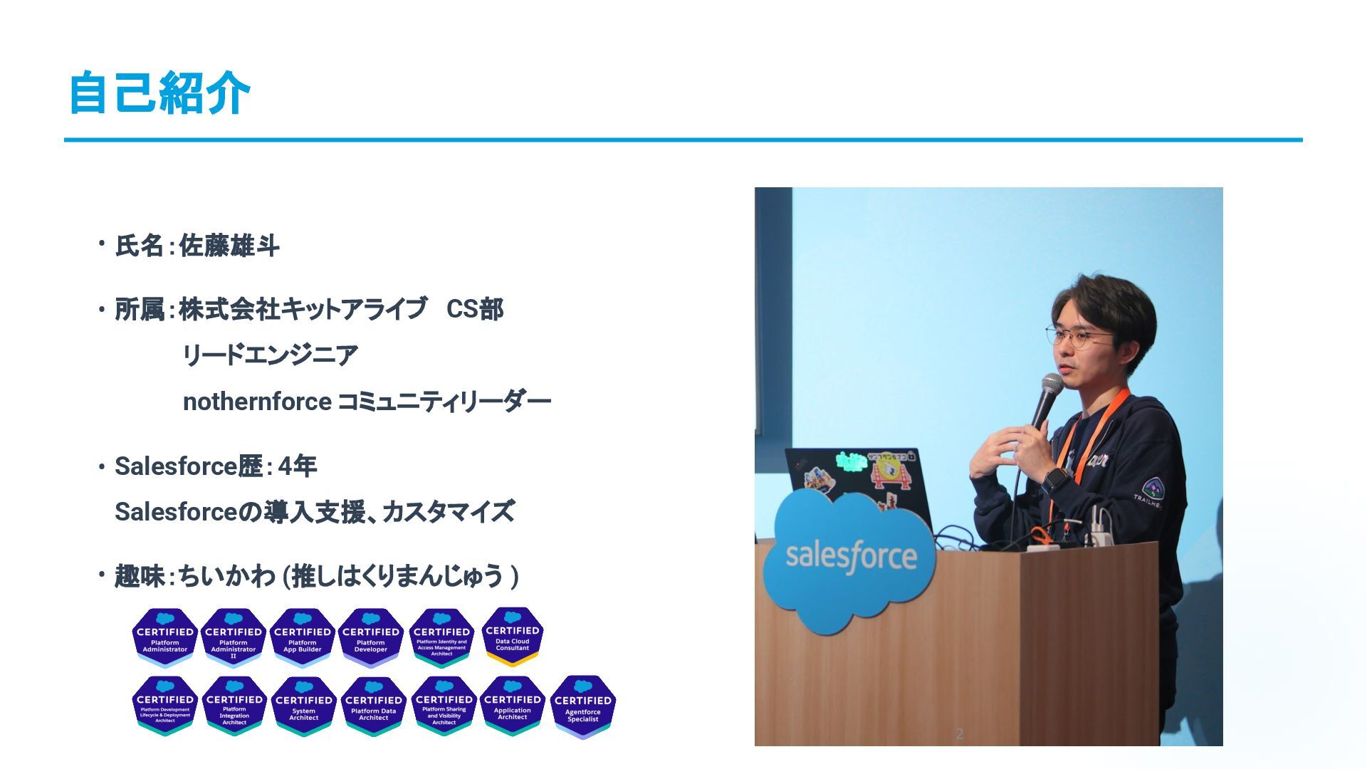 1. 自己紹介 • 氏名:佐藤雄斗 • 所属:株式会社キットアライブ CS部  リードエンジニア  nothernforce コミュニティリーダー •