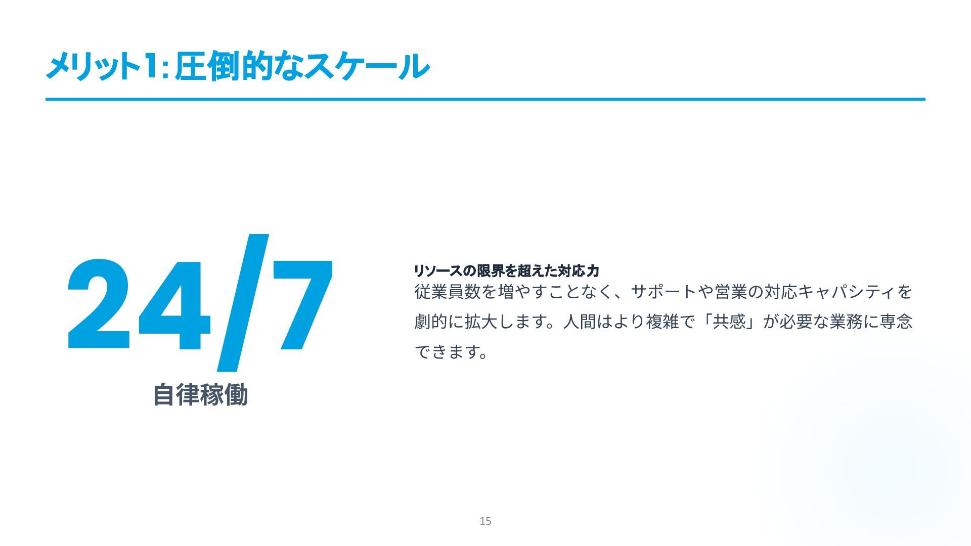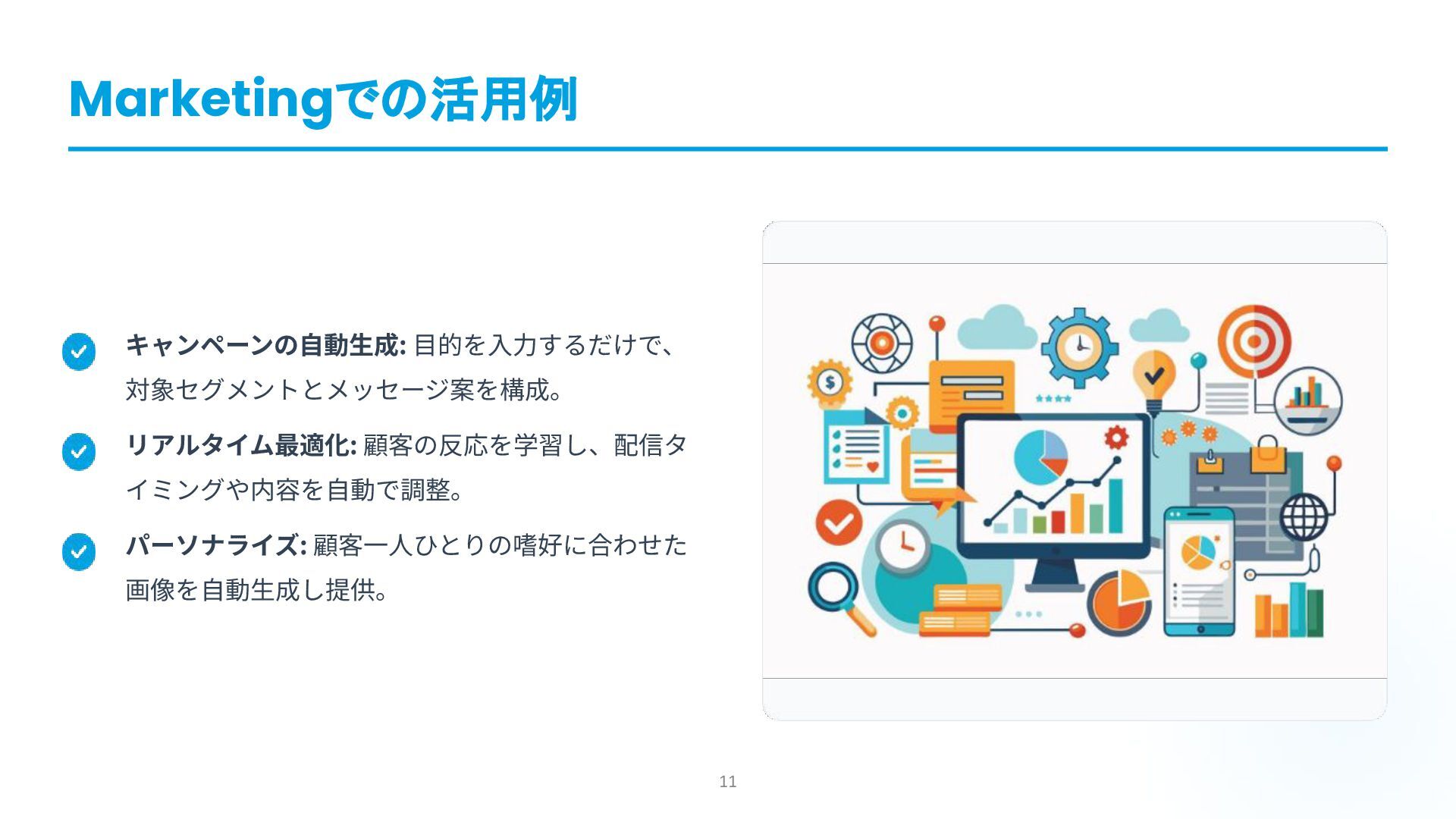 4. Service 24時間365⽇のカス タマーサポートを 完結。 Sales リード育成や商談 設定を⾃律的に実 施。 Marketing キャンペーンの企