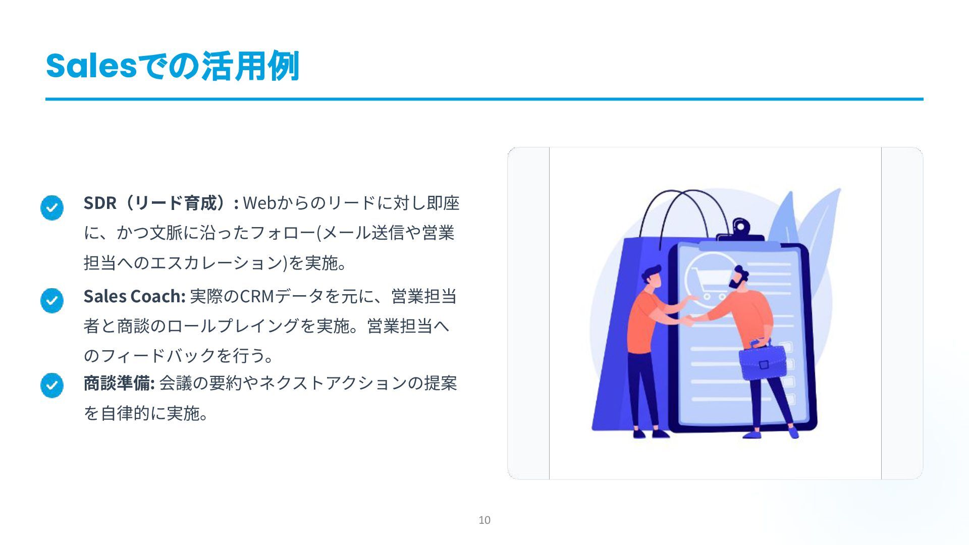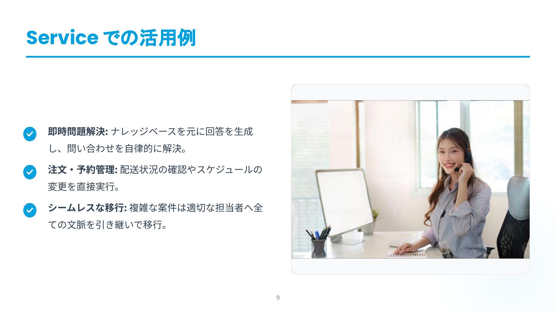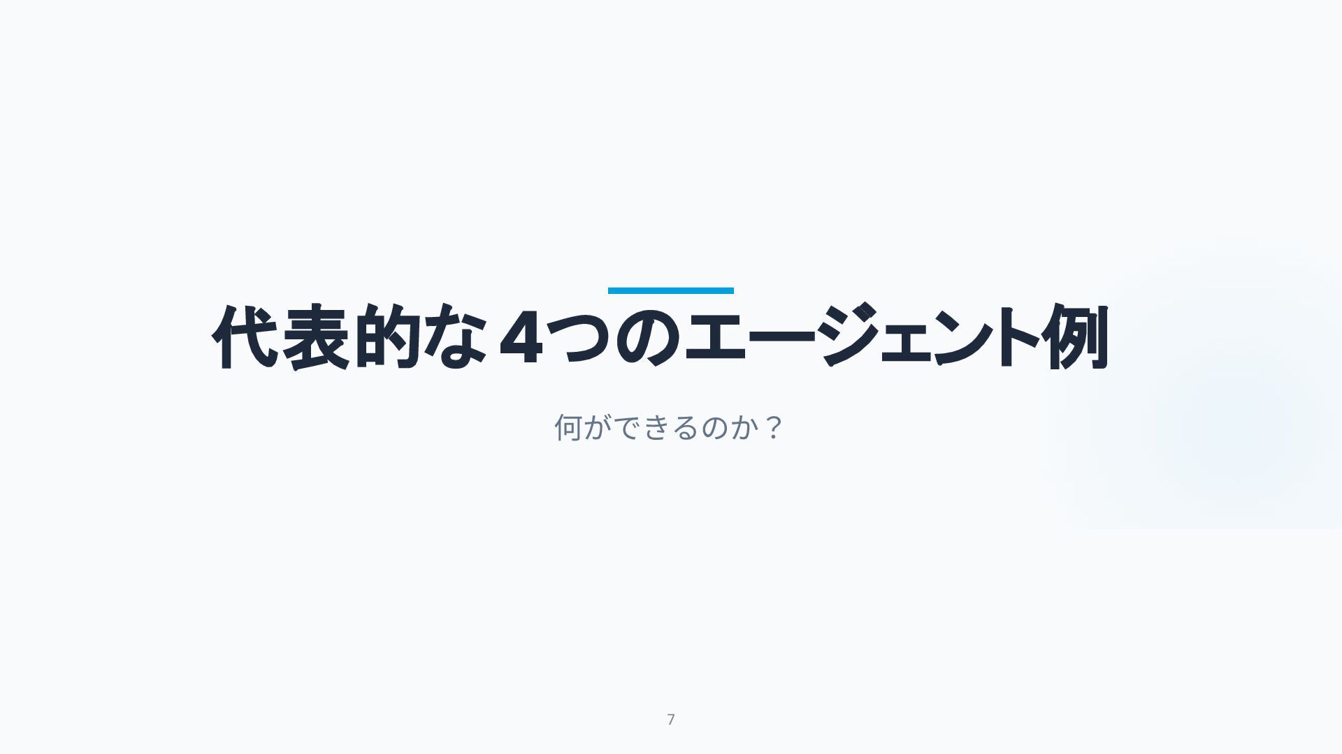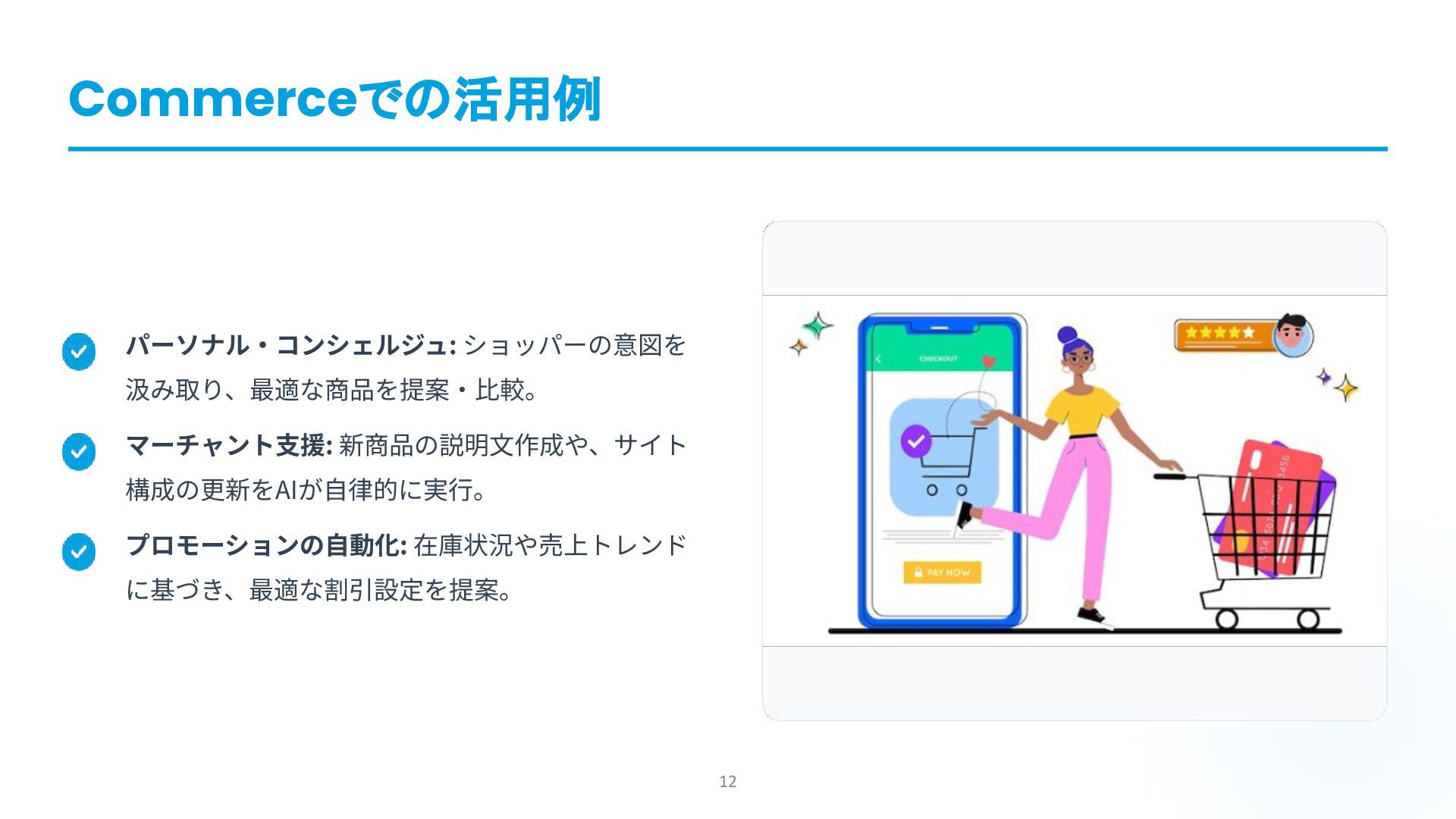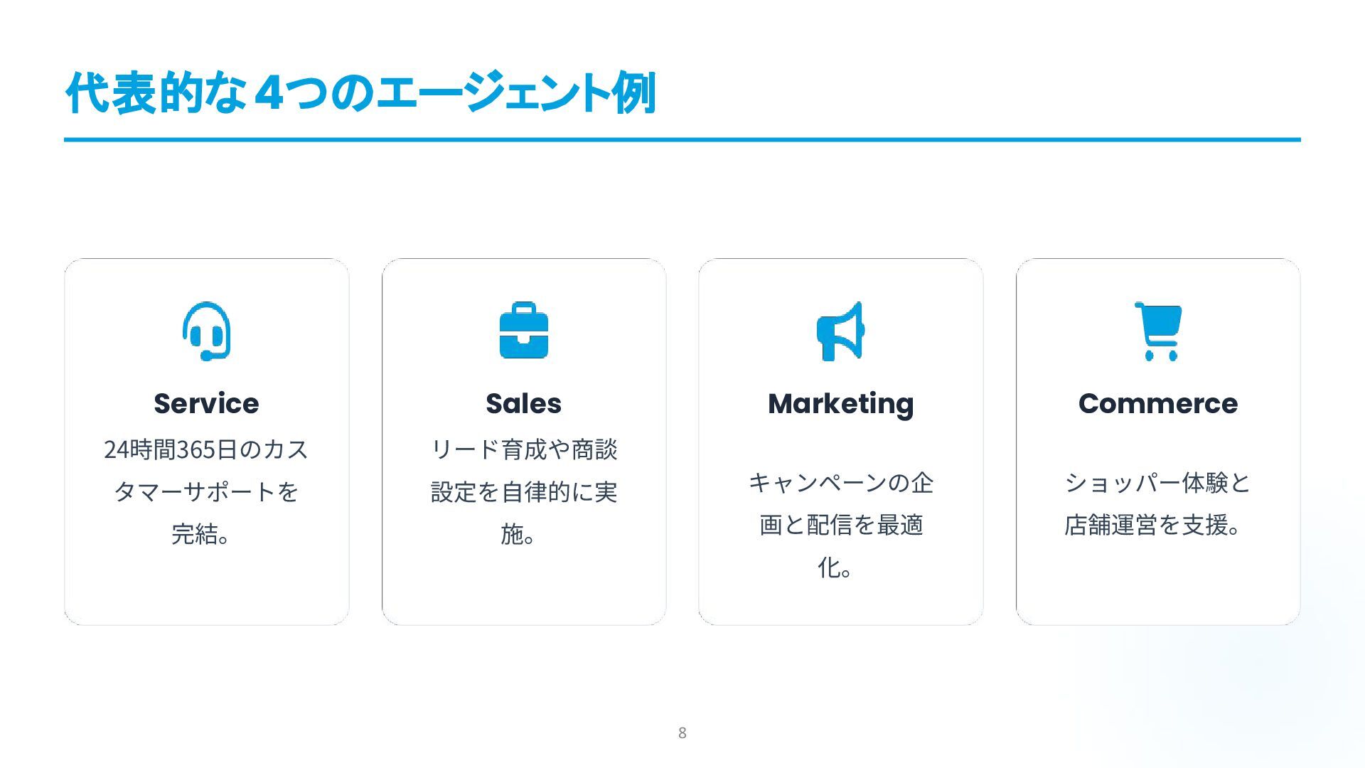 画と配信を最適 化。 Commerce ショッパー体験と 店舗運営を⽀援。 代表的な4つのエージェント例 8