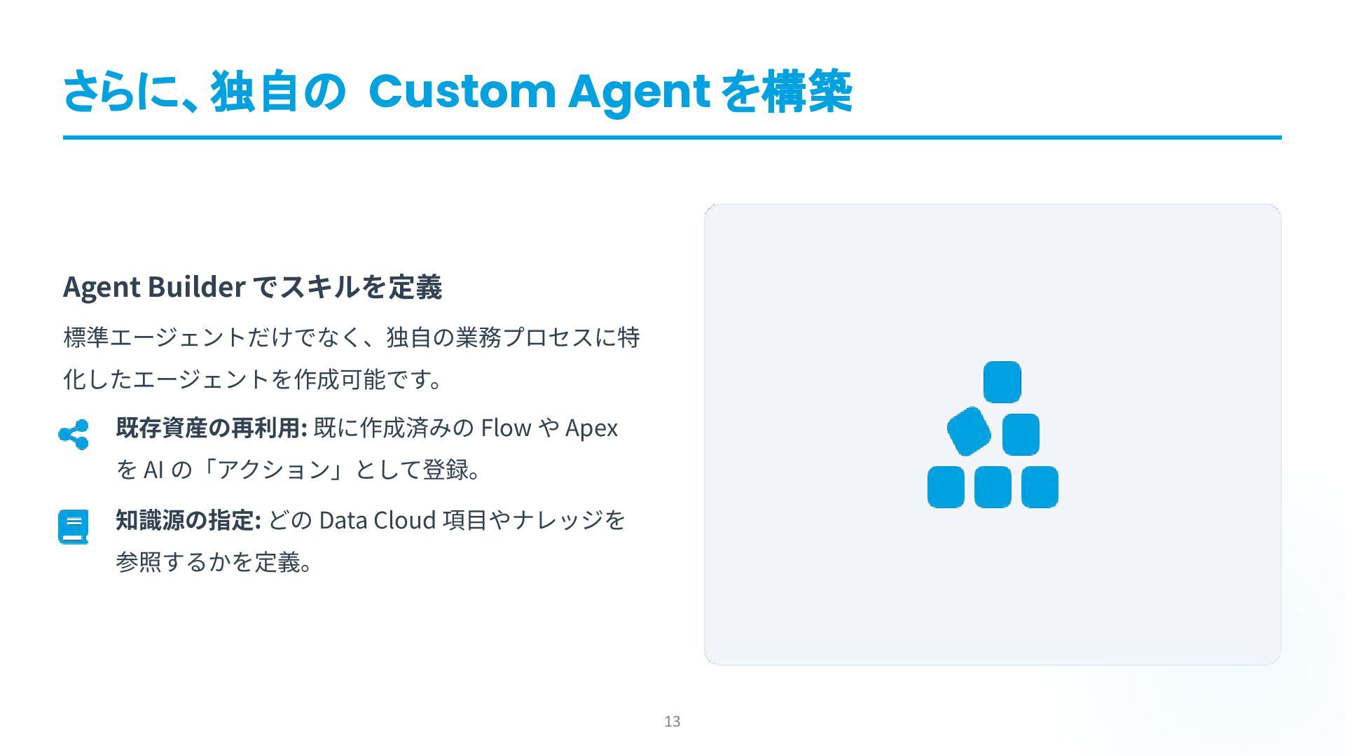 を AI の「アクション」として登録。 知識源の指定: どの Data Cloud 項⽬やナレッジを 参照するかを定義。 さらに、独自の Custom Agent を構築 13