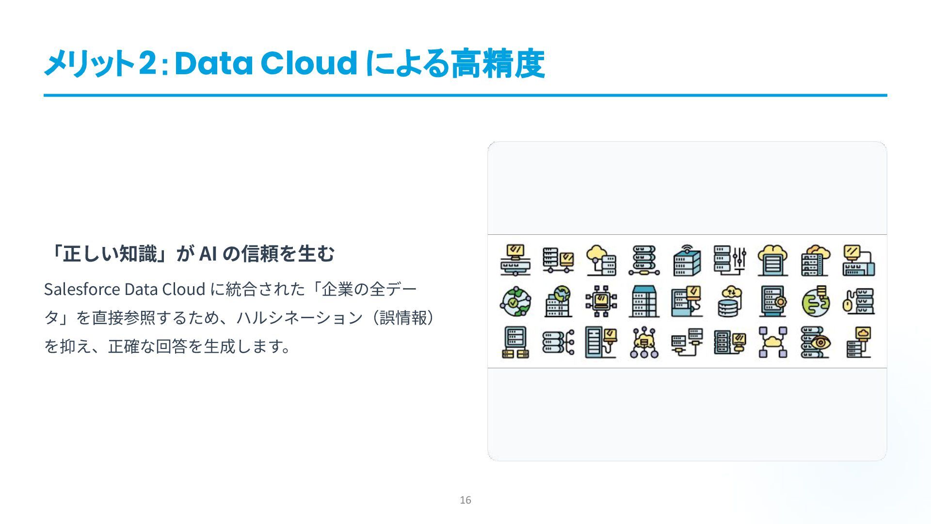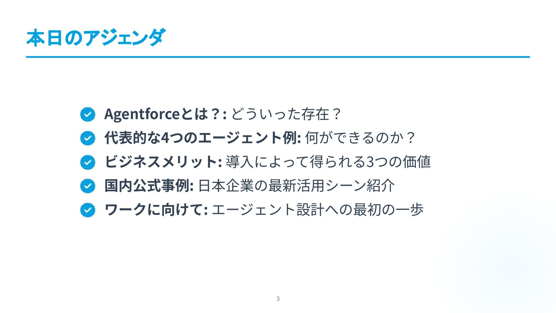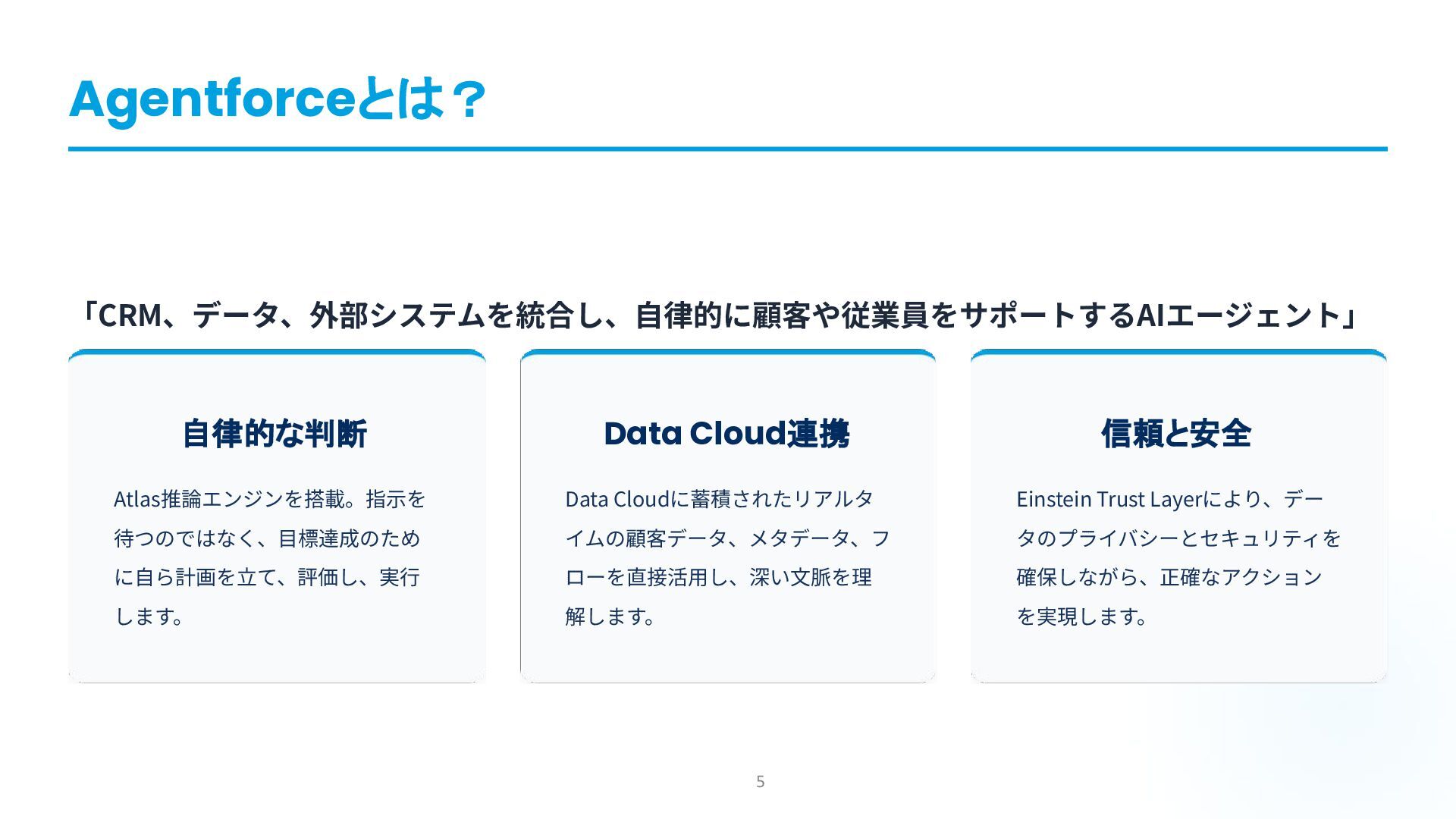 2. 「CRM、データ、外部システムを統合し、⾃律的に顧客や従業員をサポートするAIエージェント」 Agentforceとは? 自律的な判断 Atlas推論エンジンを搭載。指⽰を 待つのではなく、⽬標達成のため に⾃ら計画を⽴て、評価し、実⾏ します。 Data Cloud連携 Data